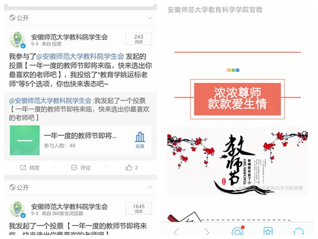 在线下活动开展得丰富多彩的同时,线上活动也在有条不紊且热烈的进行中。微信软文向我们介绍了工作在教师岗位上几位教科院老师的事迹,并通过访谈的方式了解了老师们从教的历程,对于同学们既是一种介绍,更是一次洗礼。院团委学生会在新浪微博发起“我最喜欢的教师”投票活动,引来领导的关注与学生的积极参与,一时间微博转发与评论都迅速增加。姚运标老师喜摘头冠,成为学生心目中最喜欢的教师,学生会为姚老师与其他五位老师分别送上了教师节的礼物,感谢他们的三尺讲台上的辛苦付出。