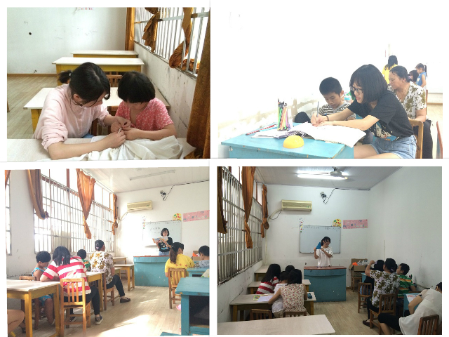 实践的第一天是星期一,队员们帮着家园内的老师一起整理、清洗被大雨弄的潮湿不堪的各种桌子,配合老师将家园内的桌椅重新布置。整理期间,对家园内部的布置有了一定的了解,家园内有着个训室、感官训练室、韵律活动厅、大教室、食堂、卧室等。整理后,家园校长将团队成员召集在一起进行谈话,对我们的到来表示欢迎,将家园内的课程安排和我们仔细沟通了一番,并对于我们的课程安排表示期待。随着家园内儿童的一个个的到来,我们对于这些一个个无法很好的吐露他们心声的天使,第一次见时的震惊,随着逐步的了解其实更多的是心疼。尽管仍然处于雨期,大风大雨不断,但是我们仍然决定运用我们的暑期时间用心竭力的完成我们的爱心服务之行。