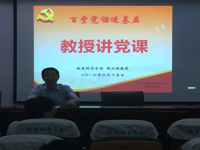 本网讯(教科院 马兴)6月15日下午,刚刚从中央党校学习归来的院教授委员会主任周兴国教授为学院全体教师党员做了一场题为《践行社会主义核心价值观是高校教师的责任与使命》的报告。