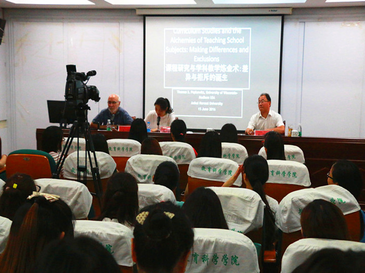 本网讯(教科院 罗萍萍/文)为进一步拓展我院研究生的学术视野,繁荣学术交流。受学院邀请,6月15日上午8点,在教科院三楼学术交流中心,美国著名课程论学者,威斯康星大学麦迪逊分校托马斯S波普科维茨教授作了题为《课程研究与学科教学炼金术:差异与拒斥的诞生》的学术报告。报告会由课程与教学论专业导师吴支奎副教授主持。