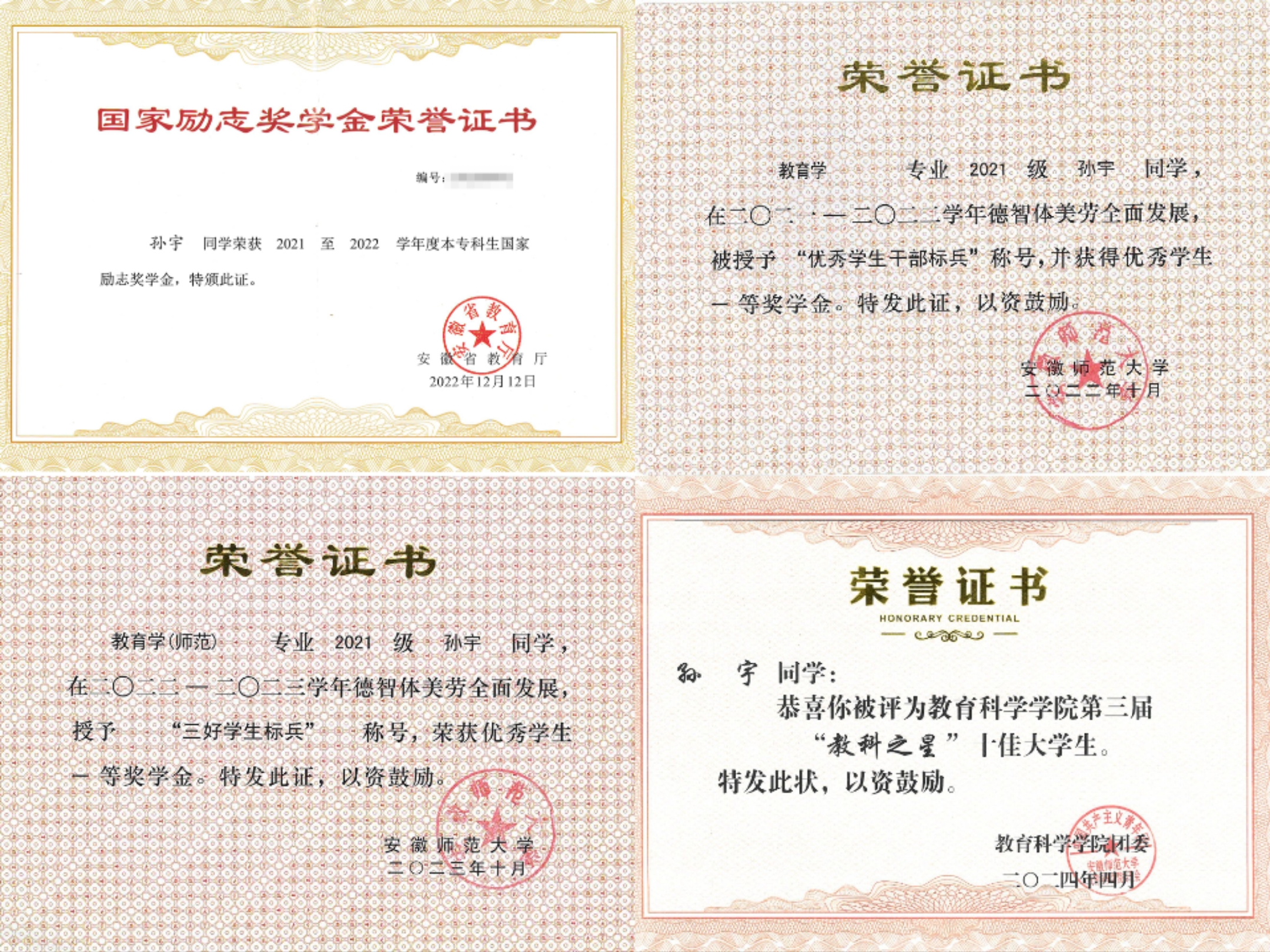 他连续三年获国家励志奖学金,连续四年获校一等奖学金,2024年获教育科学学院第三届“教科之星”十佳大学生称号(年级唯二)。课程学习之余,他善于思考和写作,在导师阮成武教授的指导下,他阅读《理想国》等经典书籍,撰写读书笔记、调查报告、课程论文,累计超过30万字。同时,他自学掌握SPSS数据统计软件、Cite Space分析软件,为学术研究打下坚实的基础。