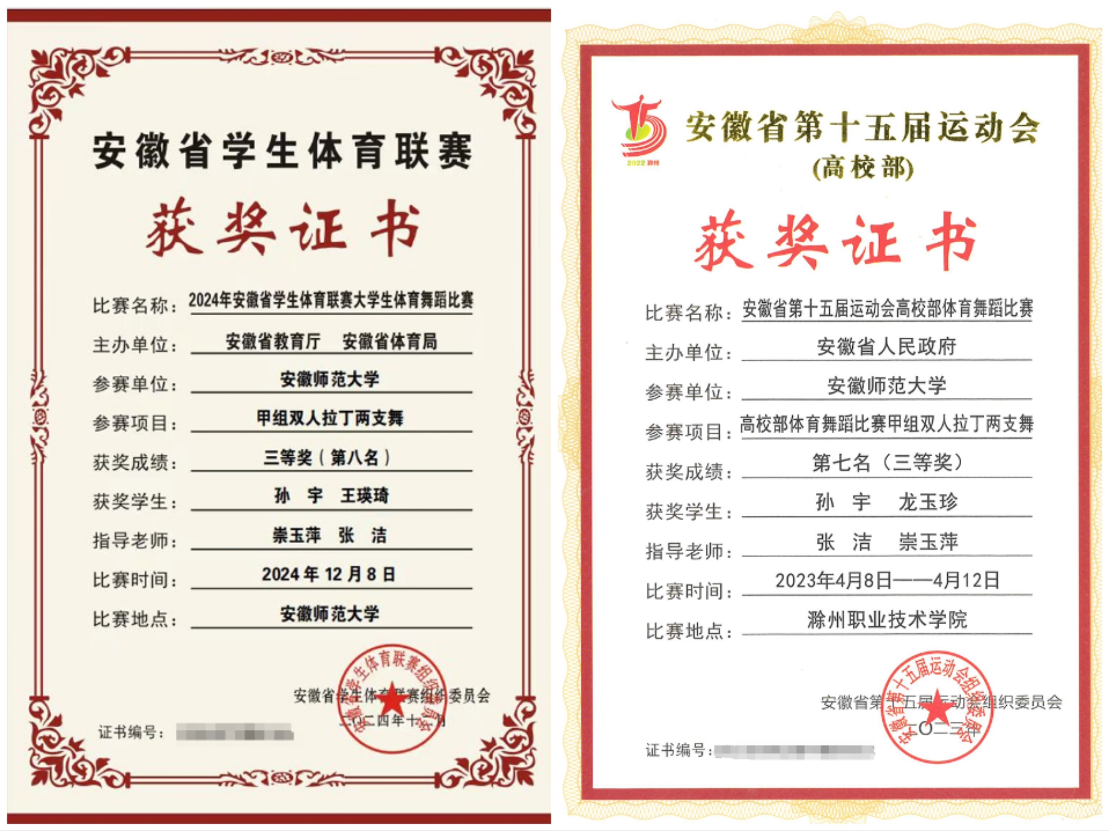 学习之余,他因个人爱好加入校体育舞蹈队。2022年暑期留校备赛第十五届安徽省运动会,荣获省级三等奖;2023年参加中国大学生体育舞蹈团体舞比赛,荣获国家级一等奖;2024年参加安徽省学生体育联赛大学生体育舞蹈比赛甲组双人拉丁两支舞,荣获省级三等奖。
