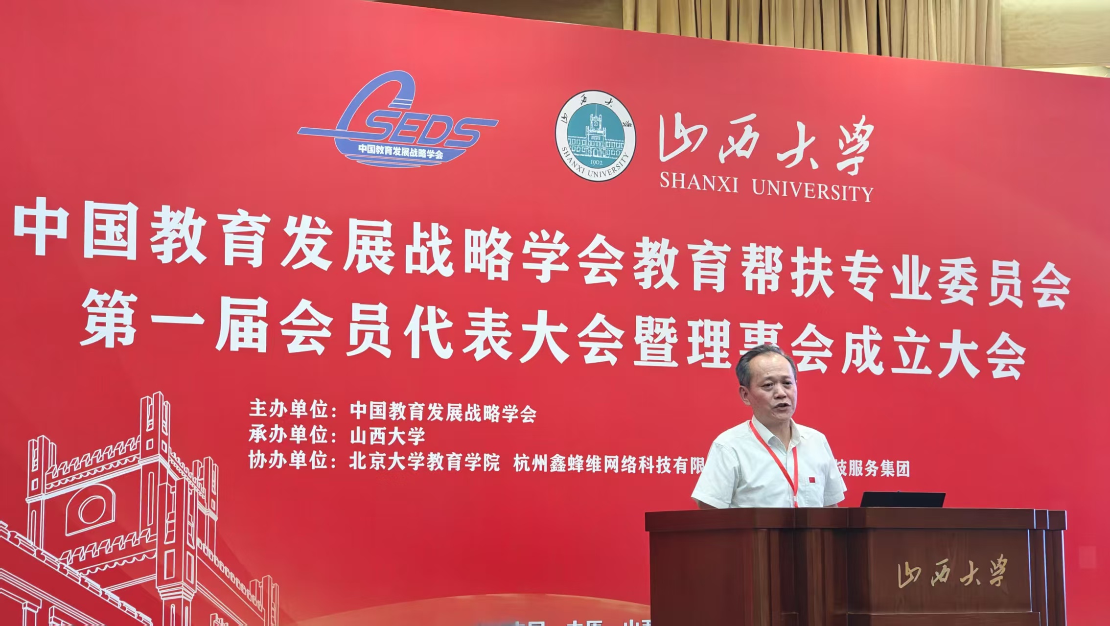 6月14日,中国教育发展战略学会教育帮扶专业委员会第一届会员代表大会暨理事会成立大会在山西大学举行。北京大学原党委书记、教育学院名誉院长闵维方,中国教育发展战略学会监事长柯春晖,陕西省教育厅和山西大学主要领导,以及应邀的专家学者和专委会成员300多人出席了成立大会。经选举,山西大学党委书记王仰麟当选专委会理事长,我校教育科学学院阮成武教授等10人当选副理事长,西南大学教育学部部长朱德全任专委会学术委员会委员,北京大学教育经济研究所副所长郭丛斌任专委会秘书长。