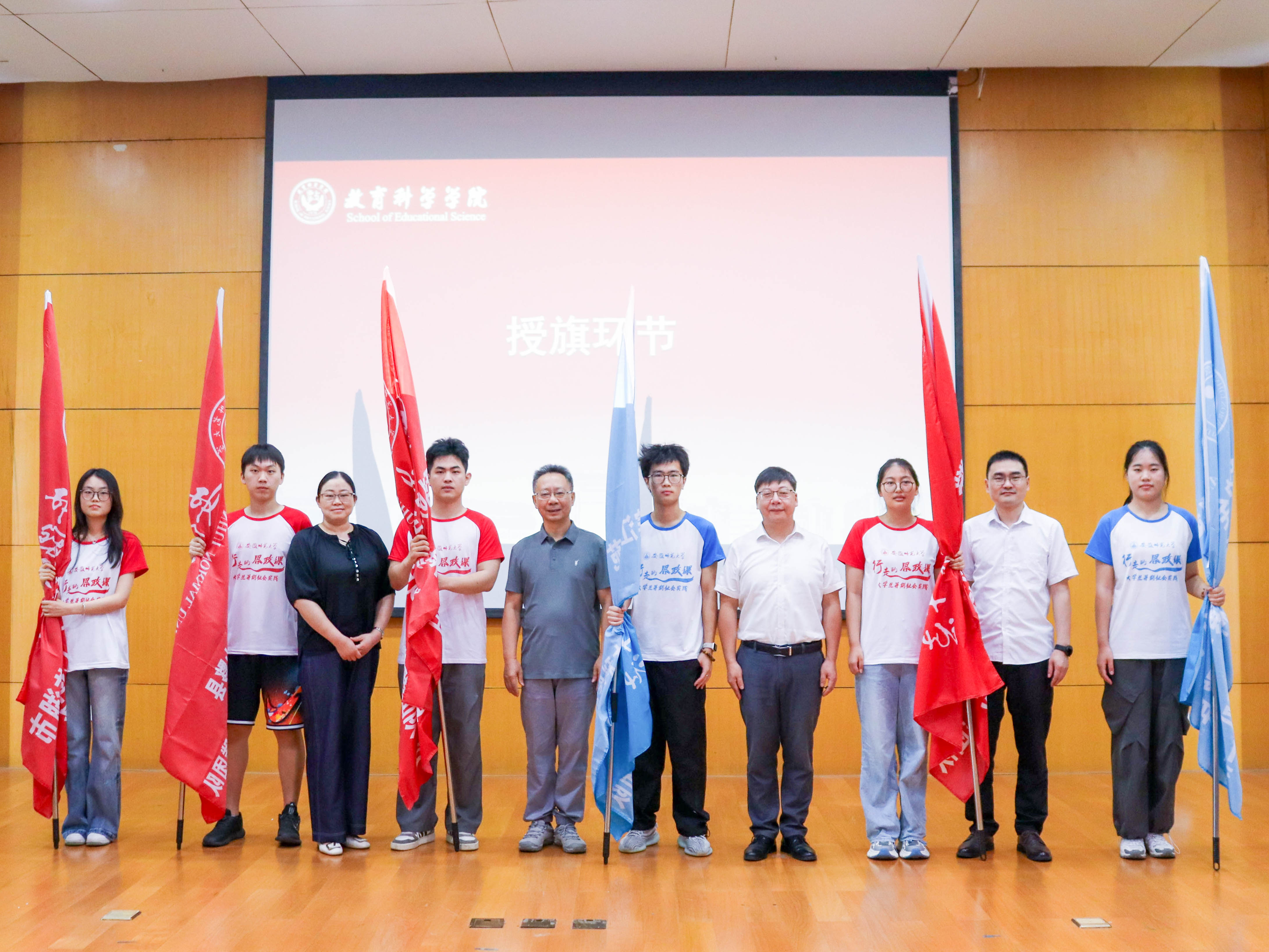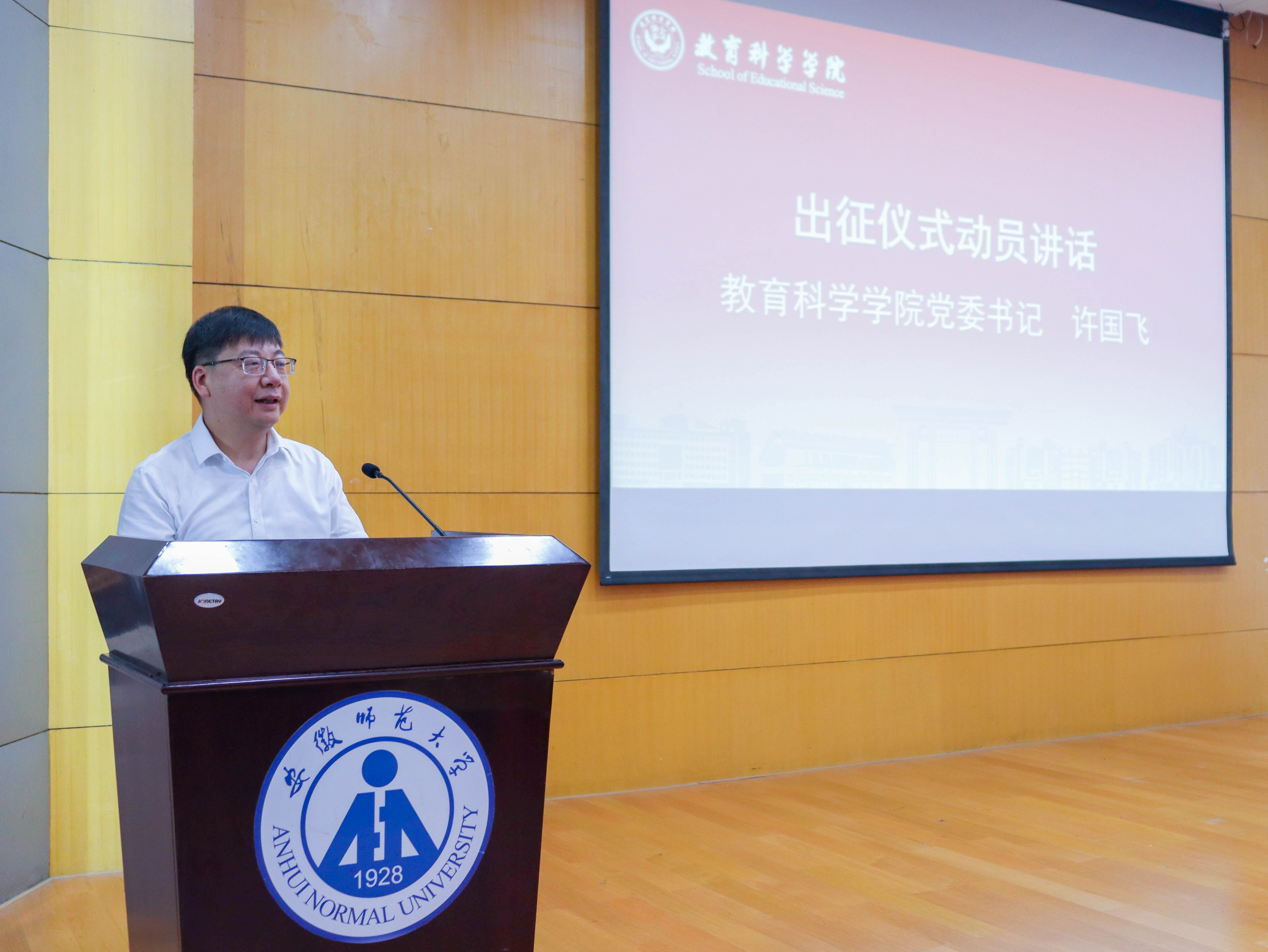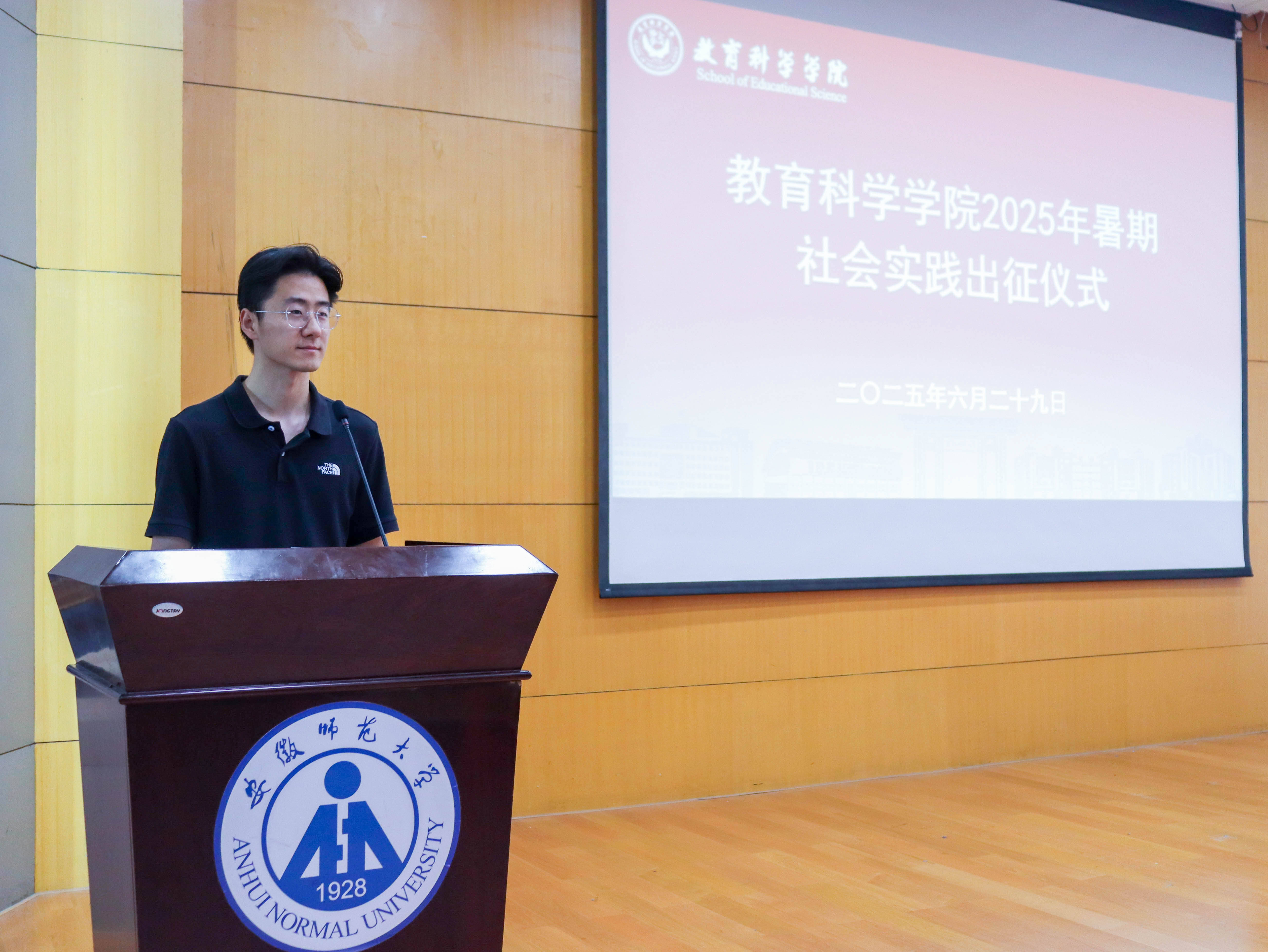 仪式在庄严的国歌声中拉开帷幕。杜凤肯定同学们为暑期三下乡实践所做的充分准备,称赞大家以严谨务实的态度完成了从选题策划到团队组建的全流程筹备,现出教科学子扎实的专业素养与强烈的社会担当。教育科学学院2025年暑期社会实践共组建38支团队,662名同学参加,其中全心全益赴马鞍山和县“和爱前行·爱心支教”等十二支队伍入选校级重点队伍,十四支队伍入选院级重点团队。