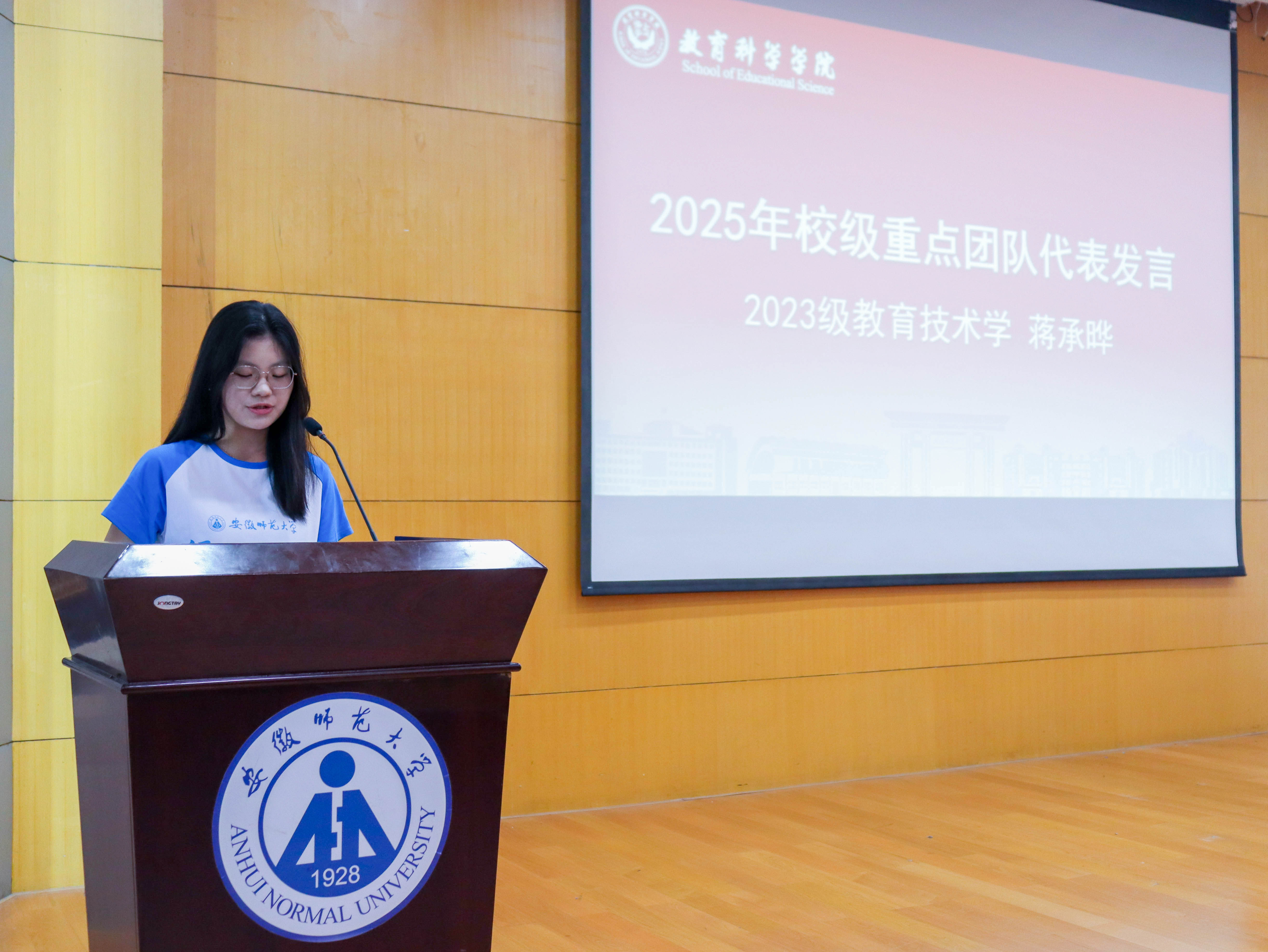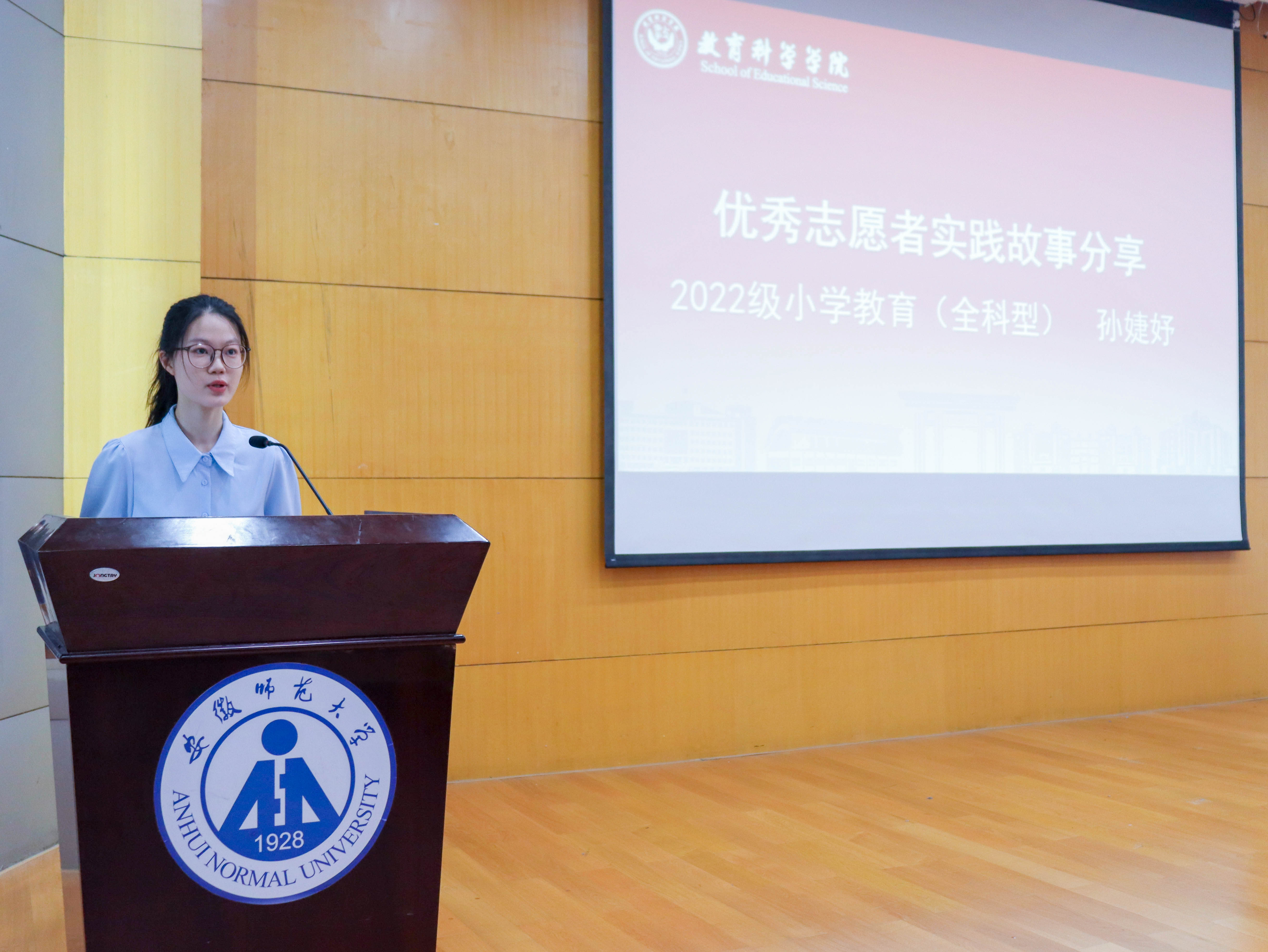 2022级小学教育全科型专业孙婕妤作为优秀志愿者代表,讲述了去年在芜湖特校与智力障碍青少年开展融合教育的经历,团队通过普通话推广、特奥旱地冰壶比赛等活动,助力特殊儿童成长,形成国家级媒体报道13篇,用行动诠释“普特融合”的教育温度。2023级教育技术学专业蒋承晔作为校级重点团队代表发言,回顾24年赴马鞍山和县支教时光,一件件温馨的故事仍历历在目在今年的暑期社会实践过程中,团队将继续保持初心、砥砺前行,在乡村教育服务中践行“学思并重、知行合一”的院训。