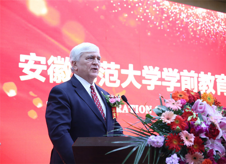 Edward Schrader在致辞中表示,他真诚相信并珍惜美国布莱诺大学与安徽师范大学双方合作的机会与努力。他认为,每个儿童就像光亮的小球,孩童的成长会给未来带来财富和光彩,教育孩童怎样学习、怎样成长对于家庭幸福、国家富强和社会进步至关重要。他呼吁从事学前教育的老师,肩负起启蒙教导下一代的重任,共同努力创设美好的世界,并相信学前教育学院未来会发展得更美好!