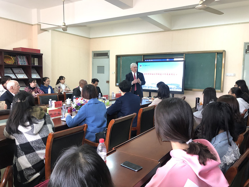 会议伊始,桑青松院长首先对布莱诺大学校领导的到来表示热烈欢迎,并表示布莱诺大学和安徽师范大学的合作不但促进了部分学科的共同进步,也对中美两国文化交流作出了很大贡献。同时,桑院长就布莱诺大学对我校学前教育专业发展的支持表示衷心感谢。随后,布莱诺大学施奈德校长与学生进行交流。他表示安徽师范大学与布莱诺大学在学前教育专业的合作已经持续5年,今年联合培养的第二批本科生即将毕业。就学生的发展、校际间的交流和学科的发展上看,施奈德校长对我校学前教育的发展前景表示积极态度,并提出会在学前教育教学法和多元文化视域下的学生学习等方面,进一步深入合作科研。此外,施奈德校长对在场学生提出两点希望,一是希望同学们多提问题,享受课堂;二是希望大家在课后也能积极主动,勇于请教。在最后的提问环节,施奈德就就学生提出的关于美国住宿、假期、生活及接机等问题做出耐心回答,帮助同学们进一步了解即将开启的异乡生活。见面会气氛轻松活跃。