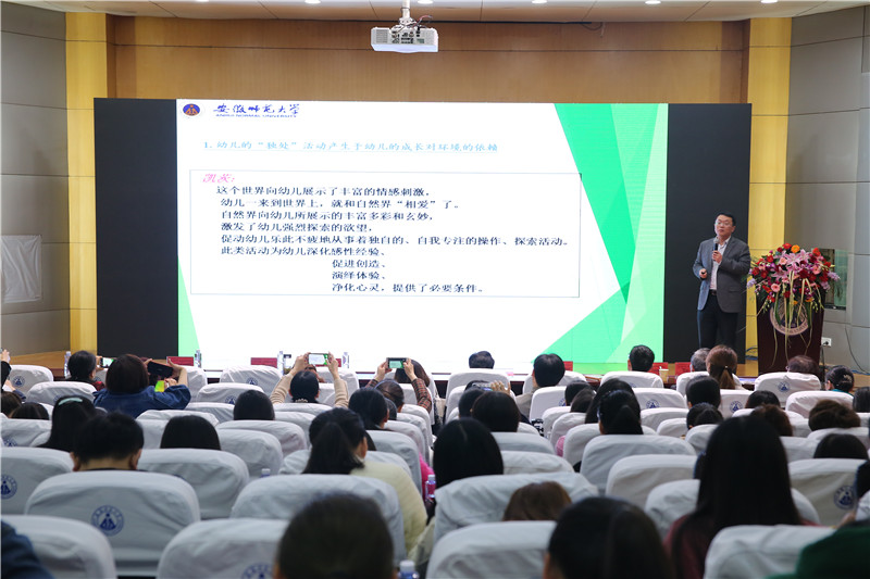 作为本次会议的东道主代表,安徽师范大学学前教育学院副院长张更立教授最后发言,他就“幼儿成长中的‘独处’活动及实现”这一主题进行了演讲。张教授分析了“独处”活动对于幼儿成长的意义。然而,因为成人的过度保护和过度干预,幼儿常常无法享受“独处”。张教授呼吁,幼儿应当能在自由、自主的时空内,进行完全自我的探索、操作,成人应当为其创造环境和条件并进行适宜的指导。