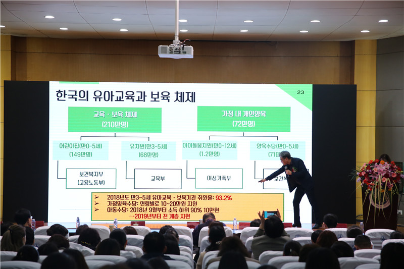 韩国教员大学金庆喆教授率先作了题为“为了幼儿的幸福的韩国学前教育”的主题发言。金教授首先介绍了韩国学前教育的宗旨是儿童的幸福,教育目的是促进儿童的全人发展,并由此引出韩国教育的基本理念——“弘益人间”。在简要梳理韩国幼儿教育制度的历史变迁之后,金教授分析了韩国“二元化”“双轨制”的幼儿教育和保育的体制。
