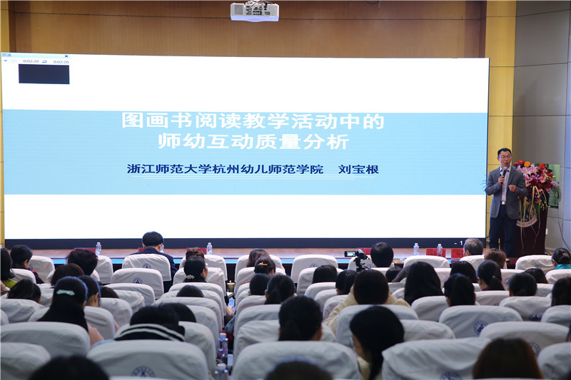 浙江师范大学杭州幼儿师范学院的刘宝根副教授向参会代表介绍了他的最新研究——“图画书阅读教学活动中的师幼互动质量分析”。刘老师通过研究发现图画书阅读教学中的师幼互动质量处于中等水平,教师在“教育支持”域上的质量较低,在图画书阅读教学中往往比较关注“语言发展”,在目标领域上的关注不均衡、有缺失。此外,教师在图画书阅读教学中的教学策略具有基础性和单一性的特点。