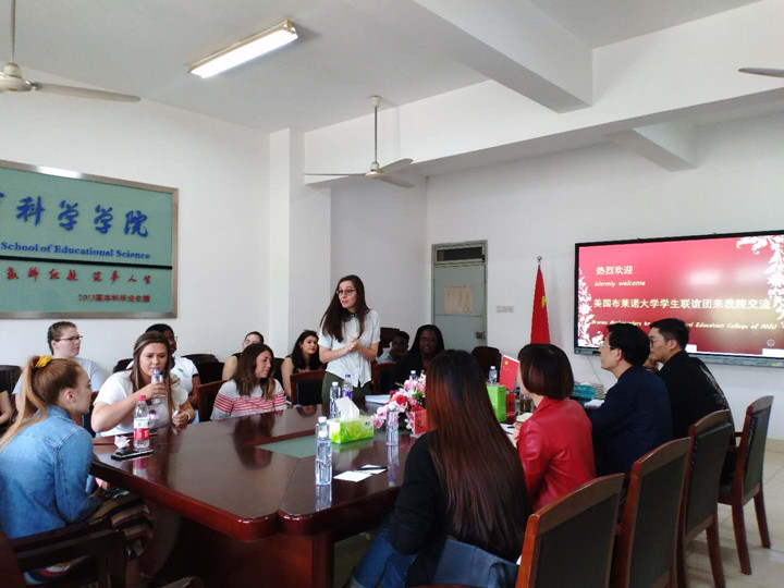 本网讯(教科院 王芬莲)5月8日下午,我院三楼会议室济济一堂,一片欢声笑语。学院2017、2018级学前教育中美班学生、部分16级中美班返校学生在此欢聚,热烈欢迎美国布莱诺大学Jordan Marie和Jessica Ann带领的学生联谊团来访。院长桑青松、副书记张如华、学前中美专业负责人赵学菊及学前教育专业教师朱立新、王芬莲等参加了会见活动。