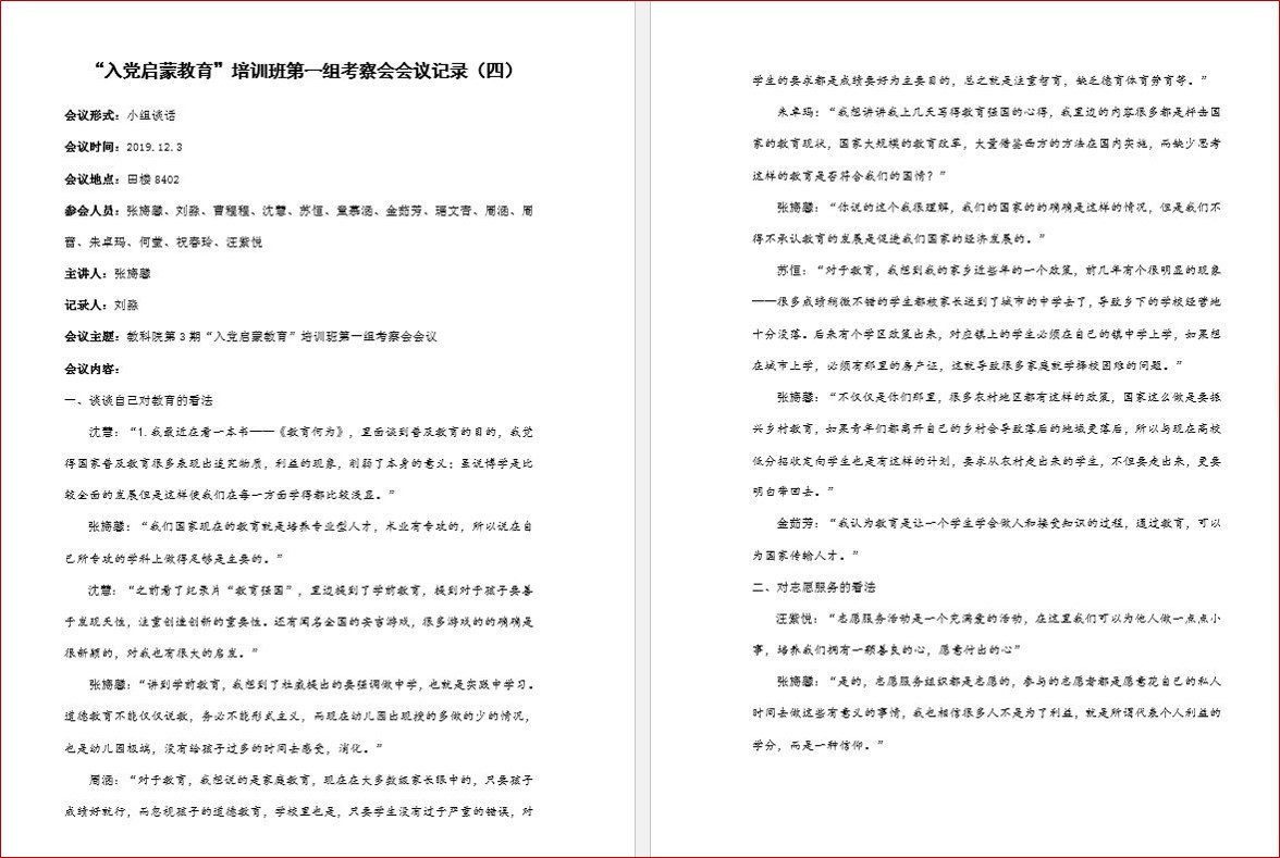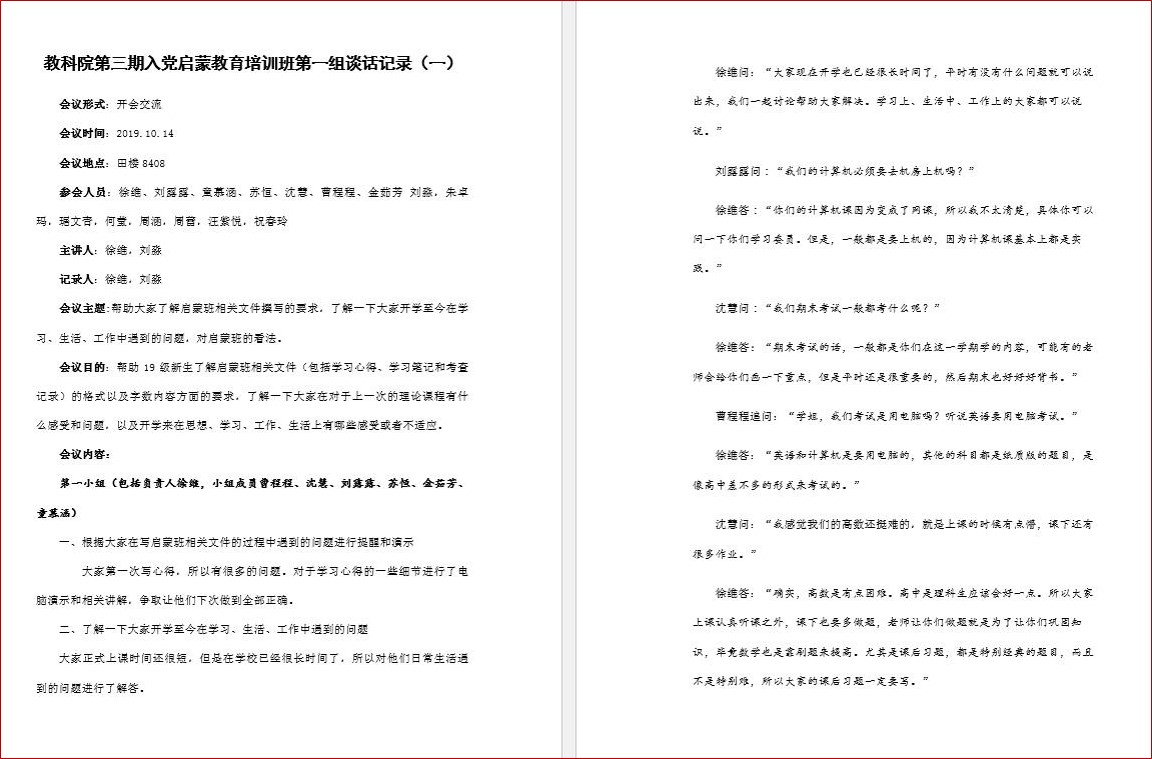 启蒙班向来重视对成员们思想动态的了解。通过启蒙服务小组,5名驻班党员和10位入党积极分子分别带领本组同学进行学习,通过谈话会,关心同学们的学习、生活等各个方面的内容,并且每两周开展一次教育考察会,及时了解本组成员的思想动态。本学期启蒙班学习心得累计256篇,座谈会与谈话会累计75次,考察记录表累计303篇。每两周一次的谈话会与考察会,驻班党员与小组长们充分了解成员们的思想动态,对成员的学习、生活、工作中产生的问题进行指导。这种交流方式,充分发挥了高年级优秀学生党员在朋辈帮扶中的作用,起到了应有的榜样引领示范作用。