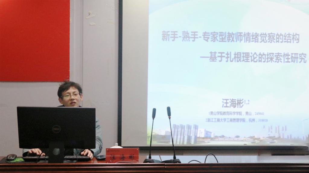 (本网讯 文/姜惠玲 图/夏彩虹)12月28日上午,黄山学院汪海彬副教授做客我院皖江心理大讲坛,进行了“新手-熟手-专家型教师情绪觉察的结构——基于扎根理论的探索”主题讲座。本次讲座于教育科学学院313学术交流中心进行,由心理健康教育专业学位硕士点负责人、硕士生导师全莉娟副教授主持,心理学专业部分教师与研究生到场学习。