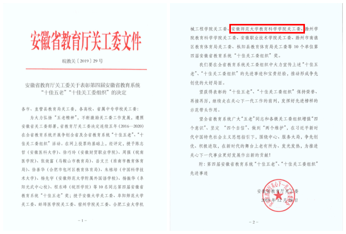 本网讯(教科院 袁黎平 裔艳)日前,安徽省教育厅关工委发布《关于表彰第四届安徽省教育系统“十佳五老”“十佳关工委组织”的决定》,教育科学学院关工委获评第四届安徽省教育系统“十佳关工委组织”。