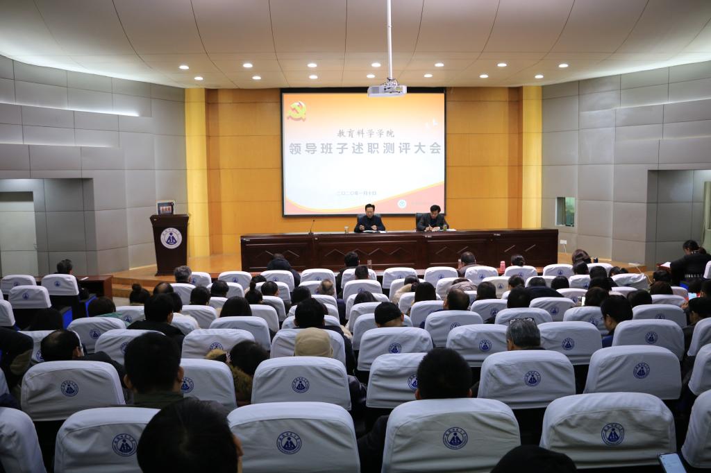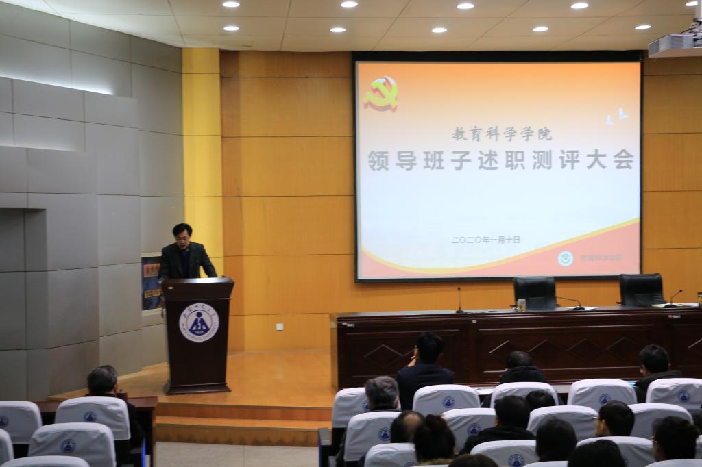 本网讯(袁黎平 孙岩岩 裔艳/文 莫大贡/图)1月10日下午,教育科学学院举行教工大会,对领导班子和成员2019年度暨任期届满进行述职测评,学院全体教师参加会议,会议由院党委书记方泓主持。