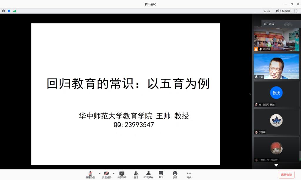本网讯(教科院 姜惠玲)为拓宽学生学术视野,引导学生探索新知,6月5日下午,华中师范大学博士生导师王帅教授应邀开讲,依托腾讯会议平台为我院师生带来了一场主题为“回归教育的常识:以五育为例”的线上讲座。讲座由我院周兴国教授主持,教育学专业教师及研究生共近200人在线聆听。