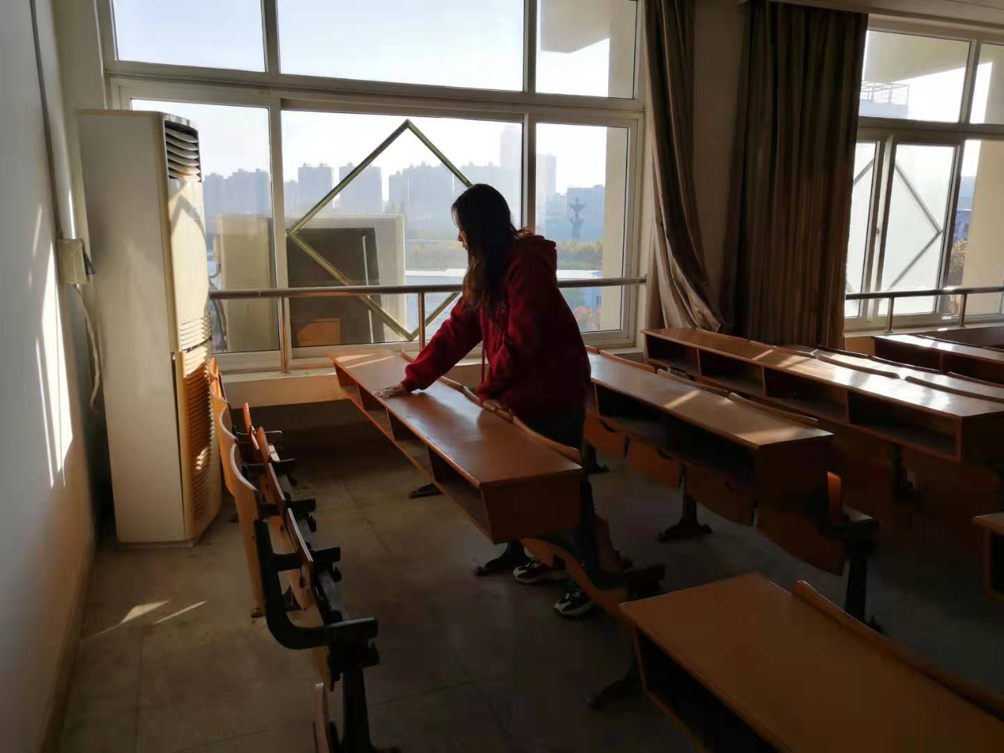 11日下午,夕阳映照下的田楼多了一抹亮丽的身影。党员教育培训班的25位学员兵分两路在每层楼的楼道,每间教室,打扫同学们上课时遗留在教室边边角角的垃圾并擦拭每一张桌子、每一块黑板。