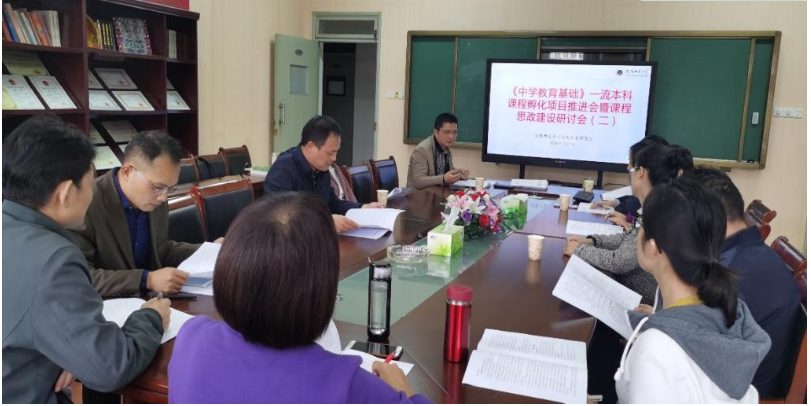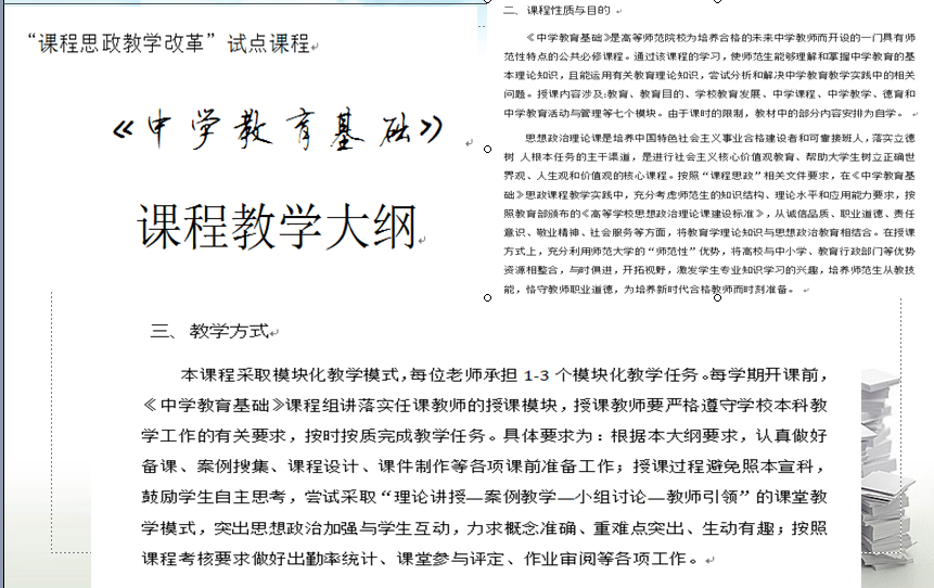 教师教育类课程的授课内容注重关注学术前沿,吸纳最新成果,开阔学生视野,也关注教育实践中所提出的新问题、新要求。尤其是,疫情防控期间,团队总负责人辛治洋教授召开三大师范类课程负责人微信视频工作会议,针对课程思政建设目标、要求,内涵等,提出总体构想,并认真组织团队成员学习《高等学校课程思政建设指导纲要》《安徽师范大学课程思政实施方案》等相关政策文件。其中,团队连续三个月召开三次“一流本科课程”孵化建设项目研讨会暨《中学教育基础》课程思政建设推进会,编制了《“一流本科课程”孵化建设项目研讨会材料汇编》,并明确了“形成一份融入课程思政元素的新修订课程教学大纲、新教案、新课件”的任务,努力将思想政治工作贯穿教育教学全过程。