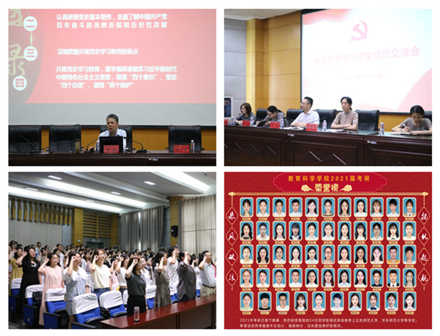 为深入开展党史学习教育,继续弘扬党的优良传统和优秀毕业生党员的先锋模范精神,6月16日中午,教科院于田楼报告厅开展毕业班党员交流会,邀请副校长陆林为大家上最后一节党课。全体毕业班党员重温入党誓词,表示要不忘初心,牢记使命,永远听党话跟党走,争做“四个合格”党员,积极投身于全面建设社会主义现代化国家新征程,为国家富强和民族振兴贡献力量。学院还为本届考研同学制作了2021届考研光荣榜,展示考研学子风采,激励非毕业班同学努力学习,向优秀学长学姐看齐。