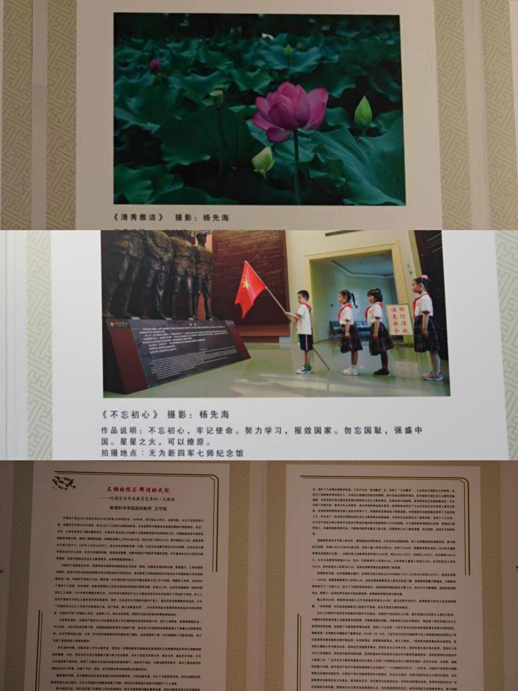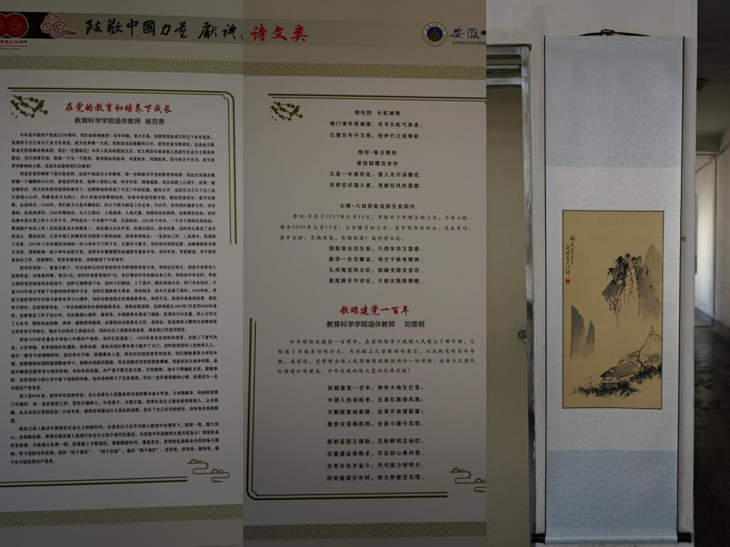 本网讯(退教协 王守恒在喜迎中国共产党成立100周年之际,由校离退休工作处和校退教协主办的“致敬中国力量,献礼建党百年”离退休教职工诗文、书画、摄影展日前顺利落下帷幕。此次展览活动是全校离退休教职工向中国共产党百年华诞献上的一份厚礼,活动开展以来,学院退休教工党支部、退教协分会在学院党委的领导和支持下积极组织退休教师参与此项活动,得到了老同志们的积极响应。本次展览全校共展出作品124篇(幅),其中教科院退休教师参展的作品15件,占所有参展作品的12%,不仅参展的作品数量多、形式多样,包括杨克贵、刘楚明、王守恒老师的诗文作品5篇(首)、林若男、陈满堂老师的书画作品4幅、杨先海、庞世焕老师的摄影作品6幅。参展作品内容丰富、主题突出,或讴歌党的丰功伟绩特别是教育变革的光辉历程,或反映伟大祖国发展的精彩瞬间,或联系自身成长过程感念党的培养教育之恩,用丹青妙笔表达对伟大祖国未来的期盼和衷心祝愿,凝聚着老同志对幸福生活的赞美,展现了老同志们奋斗不息、昂扬向上的精神风貌,受到展览组织者和广大观众的好评。