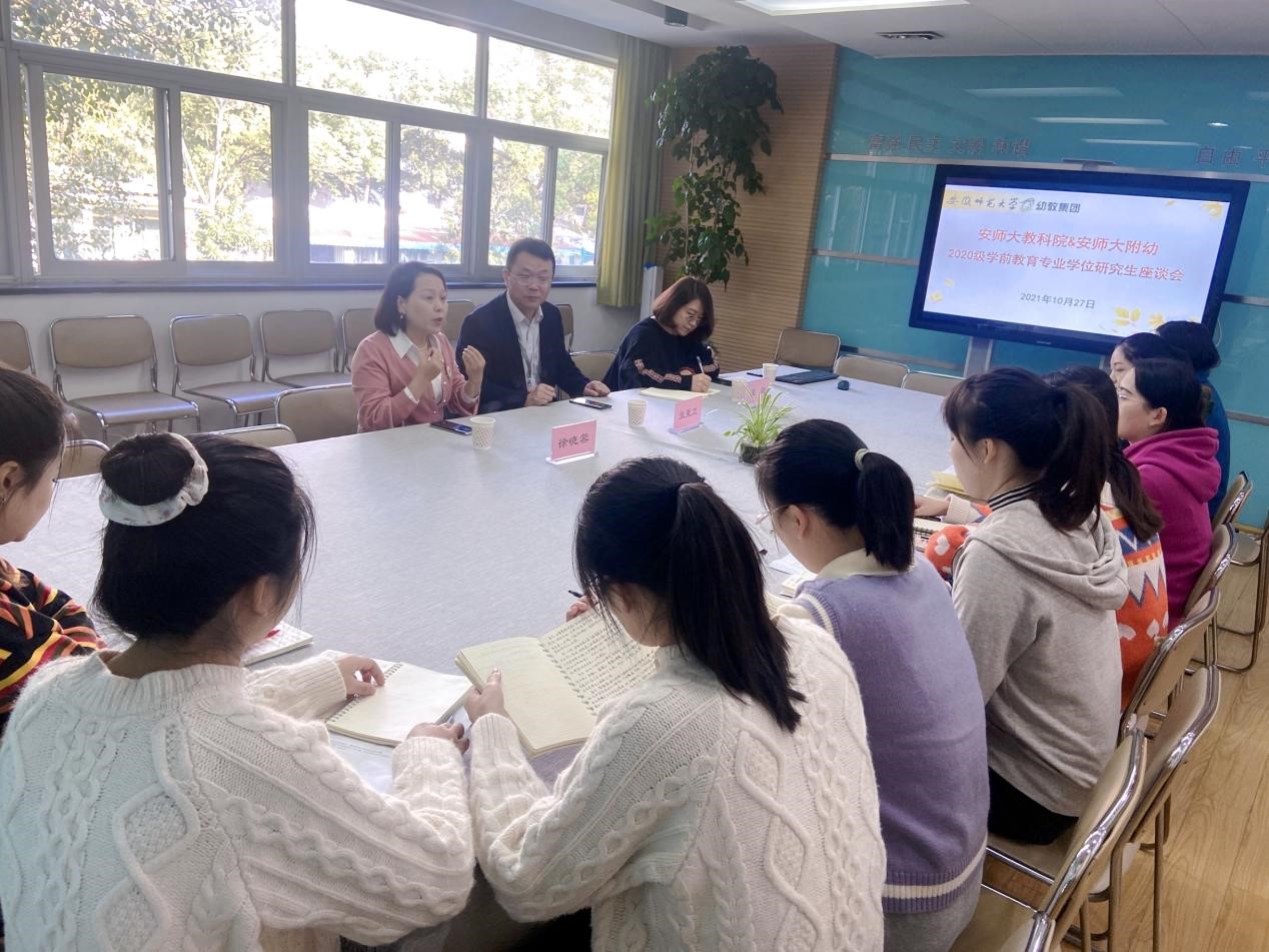 师大幼教集团副主任徐晓蓉和师大附属幼儿园教学副园长汪玲给予热情接待,并参与了座谈。座谈会上,徐晓蓉介绍了实习研究生在师大附幼的学习、生活情况。实习生代表许慧颖以“见幼儿、见教师、见自身”三个方面对在师大附幼儿园的实习进行了总结汇报,表示收获颇丰,在幼儿园直观了解了幼儿的一日生活过程,感受了优秀教师的职业素养和精神能量,促进理论知识在教育教学实践中的应用。实习指导教师则分别从学生为人师表、学习态度、实习表现以及未来期待等几个方面做了点评,对实习生所表现出来的虚心好学、勤奋务实、善于反思等良好素养给予了充分肯定和积极评价。