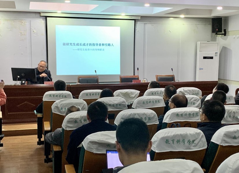李宜江在培训会中从学院管理角度出发,强调导师队伍素质是决定研究生培养质量的关键因素,导师队伍建设是推进研究生教育发展乃至学院发展的关键所在。他提出师德师风建设的三大支柱:一是正确理解师德,他强调师德是导师自身道德的养成,德高为师,身正为范,良好师生关系建立的关键在于学生对导师的信任;二是正确践行师德,他对甲骨文“教育”二字进行剖析,指出导师应关注研究生思想政治教育、学术训练规范、创新能力培养等方面,基于学生现有水平,刚柔并济,引导、指引并督促学生,努力实现全过程育人、全方位育人;三是?正确衡量师德。他结合个人实际工作经历,提出三条衡量标准,即“两主动一热情”,并表示学生一定程度上是导师学术生命、人格生命、社会生命、综合生命的延续。最后,他倡导全体研究生导师要牢记职责、立德树人、熟知规则、提升能力,引导学生达到理想的彼岸。