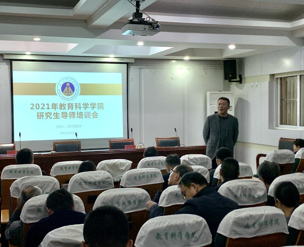 本网讯(文/牛雪梅 图/孙瑜瑶)11月17日下午2点,教育科学学院2021年研究生导师培训会在学术交流中心举行,学院教授委员会主任、博士生导师周兴国,学院院长、博士生导师李宜江担任本次培训的主讲人。本次培训由研究生工作分管院长张更立主持,我院全体研究生导师参加培训。