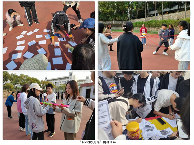 为号召同学们“走下网络、走出宿舍、走向操场”,增强大学生的集体凝聚力和身体素质,10月底至11月上旬,学院大学生发展辅导站联合大学生心理研究协会于西操场面向全体新生和部分老生开展“同心SOUL递”团辅活动。经前期分组后,各个队伍共同完成了摸石过河、同心击鼓、不倒森林、珠行万里、极速60s等五个项目。在整个游戏过程中,队员们积极参与,活动氛围既紧张又充满乐趣。根据游戏完成情况,主持人为优秀队伍颁发奖品。通过此次户外团辅活动,同学们不仅释放了学业的压力,还收获了真挚的友谊。