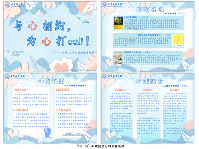 为积极营造健康向上的环境,教科院大学生发展辅导站联合院团委,制作专题展架宣传心理健康教育知识,并发起“教师寄语”征集活动,路宝利、王清、张冬梅、王成刚、高宇、吴钦金、席鹏、滕曼曼、莫大贡、程啸等10位教师为同学们献上温暖寄语,鼓励学生积极向上、不畏风雨,勇往直前、走向成功。此次征集活动形式新颖,不仅拉近了师生的距离,也积极引导了学生的心灵方向。