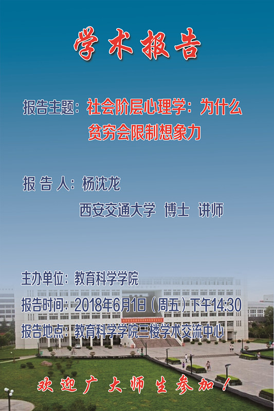 学术报告预告:社会阶层心理学:为什么贫穷会限制想象力
