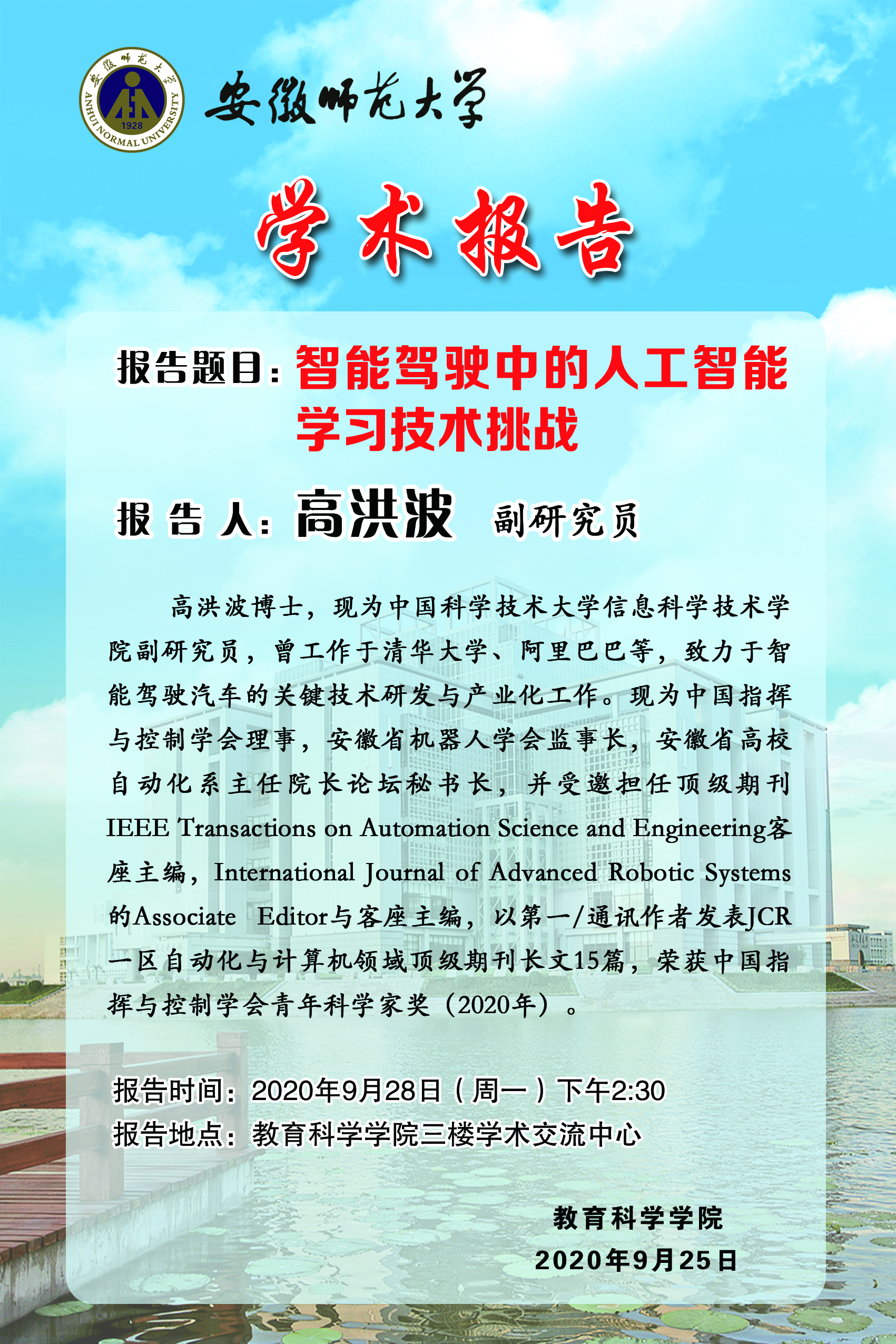 学术报告预告:智能驾驶中的人工智能学习技术挑战(高洪波)