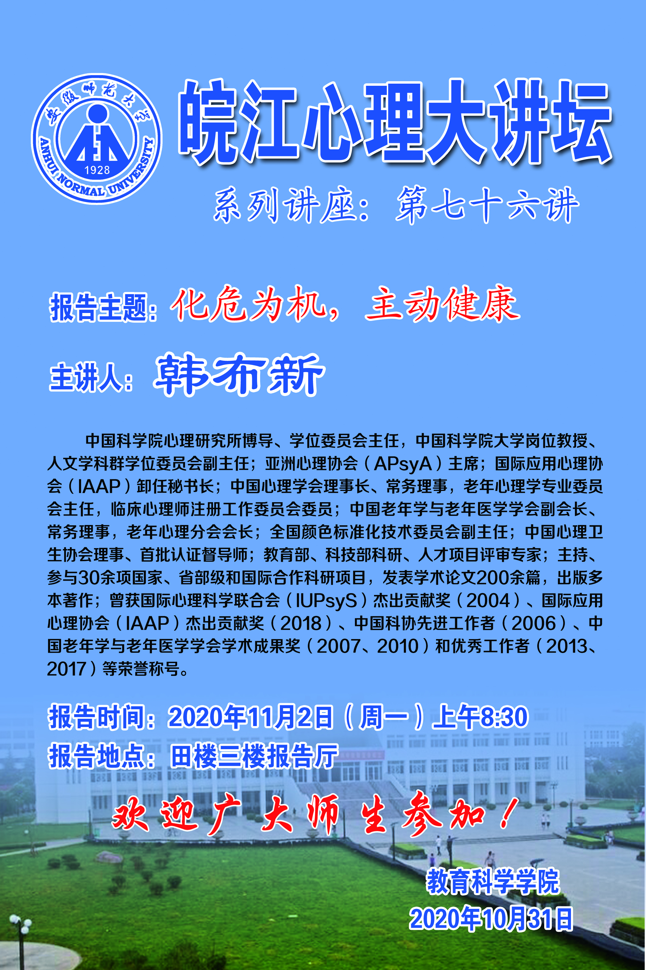 学术报告预告:韩步新——化危为机,主动健康