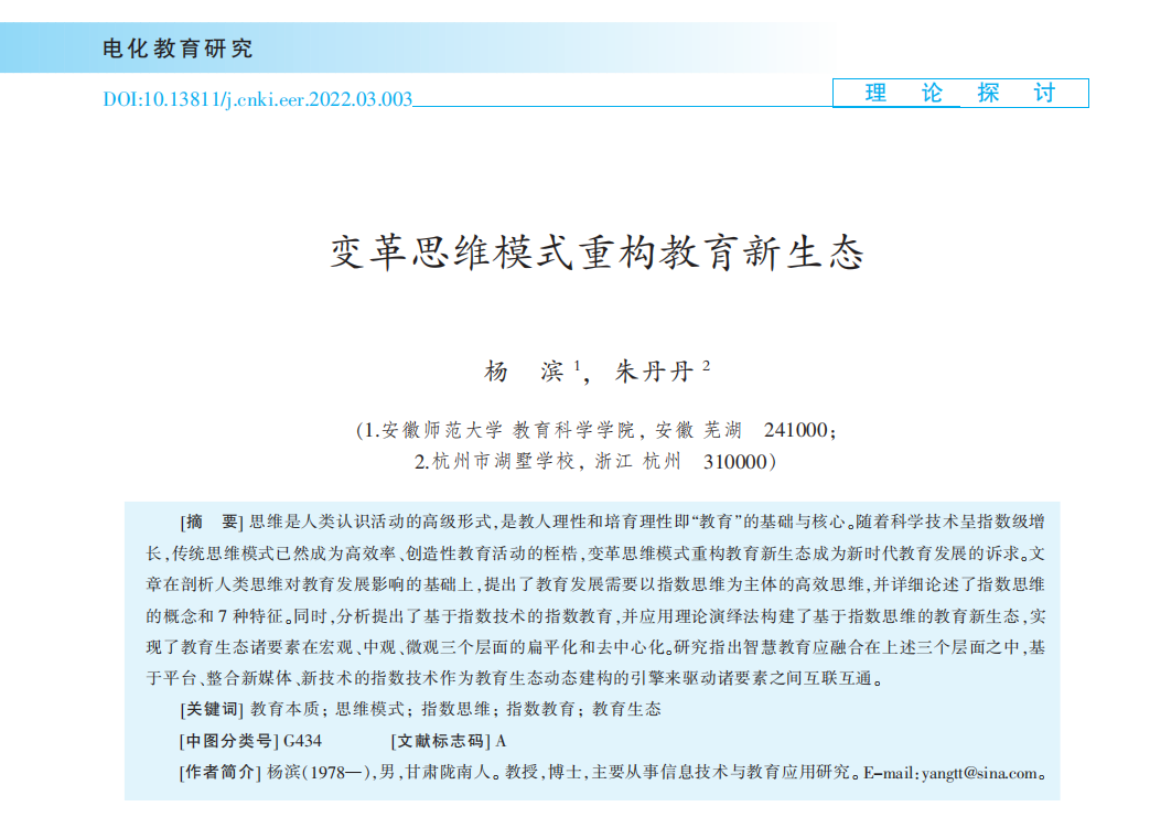 思维是人类认识活动的高级形式,是教人理性和培育理性即“教育”的基础与核心。随着科学技术呈指数级增长,传统思维模式已然成为高效率、创造性教育活动的桎梏,变革思维模式重构教育新生态成为新时代教育发展的诉求。文章在剖析人类思维对教育发展影响的基础上,提出了教育发展需要以指数思维为主体的高效思维,并详细论述了指数思维的概念和7种特征。同时,分析提出了基于指数技术的指数教育,并应用理论演绎法构建了基于指数思维的教育新生态,实现了教育生态诸要素在宏观、中观、微观三个层面的扁平化和去中心化。研究指出智慧教育应融合在上述三个层面之中,基于平台、整合新媒体、新技术的指数技术作为教育生态动态建构的引擎来驱动诸要素之间互联互通。