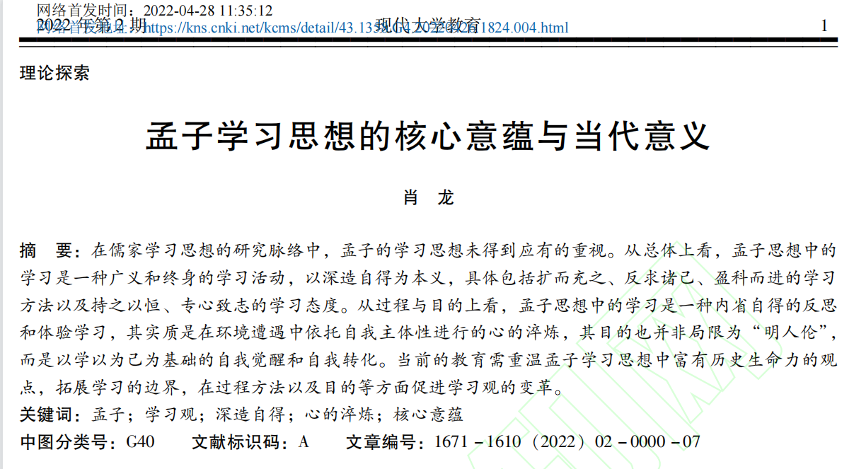 在儒家学习思想的研究脉络中,孟子的学习思想未得到应有的重视。从总体上看,孟子思想中的学习是一种广义和终身的学习活动,以深造自得为本义,具体包括扩而充之、反求诸己、盈科而进的学习方法以及持之以恒、专心致志的学习态度。从过程与目的上看,孟子思想中的学习是一种内省自得的反思和体验学习,其实质是在环境遭遇中依托自我主体性进行的心的淬炼,其目的也并非局限为“明人伦”,而是以学以为己为基础的自我觉醒和自我转化。当前的教育需重温孟子学习思想中富有历史生命力的观点,拓展学习的边界,在过程方法以及目的等方面促进学习观的变革。