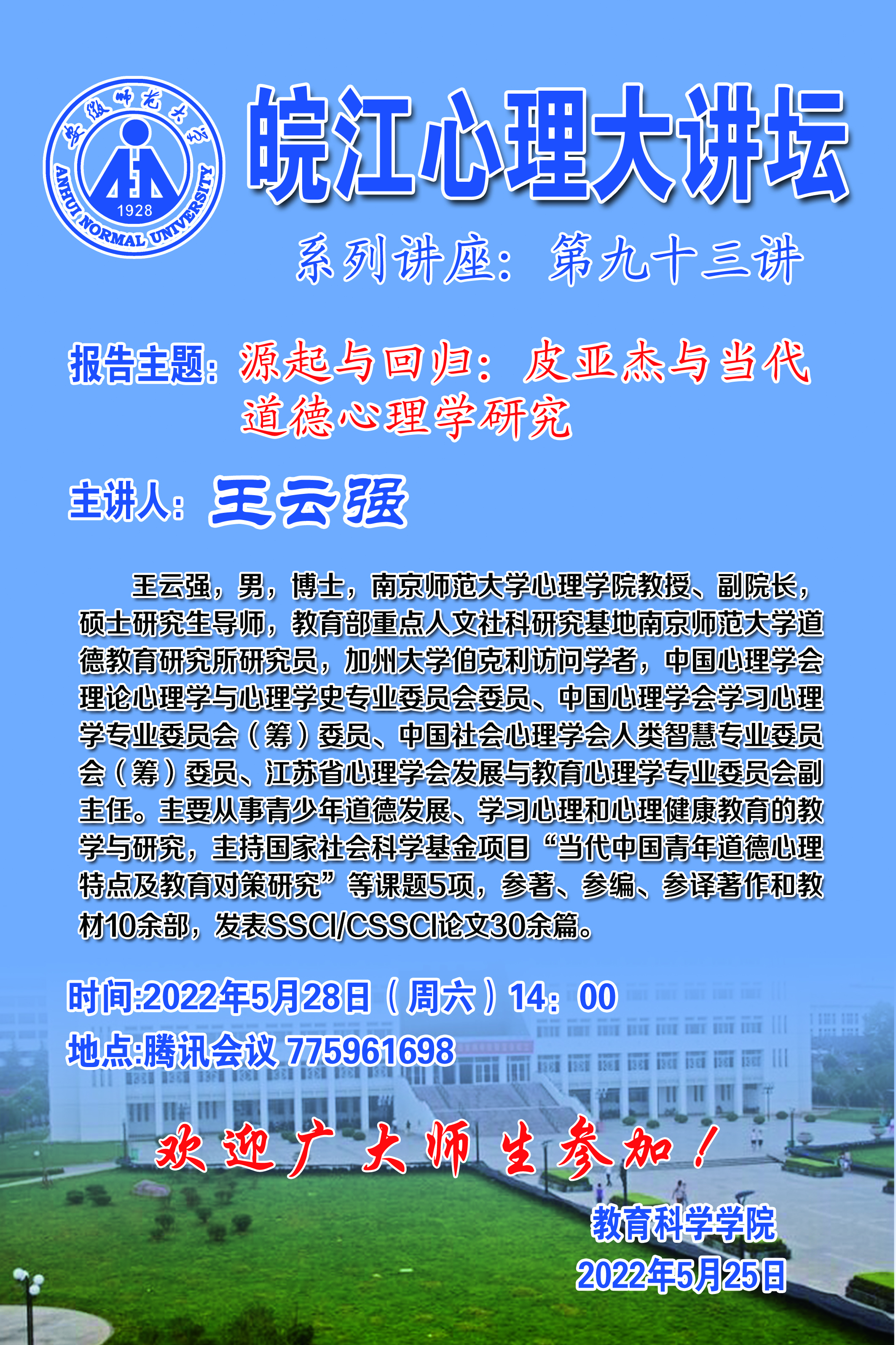 【学术预告】皖江心理大讲坛第九十三讲:源起与回归:皮亚杰与当代道德心理学研究