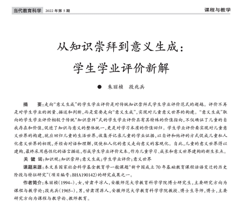 走向“意义生成”的学生学业评价是对传统知识崇拜式学生学业评价范式的超越。评价不再是对学生学业的测量、描述和判断,而是需要走向“意义生成”,实现对儿童意义世界的构建。“意义生成”取向的学生学业评价相较于传统“知识崇拜”式的学生学业评价具有其特殊的价值指向,不仅确证了儿童的自我存在和价值,促进了知识与意义的整体统一,更是对学习本质的价值回归。学生学业评价要实现对儿童意义世界的构建,就应回归儿童的生活世界,收集并记录儿童的学业证据,以自评和他评的方式促成儿童私人化意义世界的初现,并经由对话和理解,促使私人化的意义走向意义的客观化。自此,儿童的意义世界得以建构,最终采用感性化的语言描述,形成学生学业评价文本,作为儿童学习、成长和意义世界建构的新生长点。