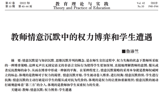 情意沉默是与知识沉默、思维沉默并列的概念,是在师生交往过程中、权力失衡的状态下教师所采取的一种博弈策略,这种无声且无固定语义的非语言交际行为使得学生更加深刻、直接地理解教师的意图,服从或者反抗教师的命令,从而在博弈中形成一种新的平衡。在某种程度上,情意沉默策略的采用本身就是教师权威树立的标志,体现的是教师对于权力的渴望。情意沉默开始,学生被动卷入博弈,进行权衡;情意沉默持续,学生进行抗衡;情意沉默的主动打破是以学生的服从或对抗为代价的,体现的是权力的让渡和重新组织;情意沉默的被动打破则意味着“第三方”的介入,体现的是教师和学生双重权力的失效。