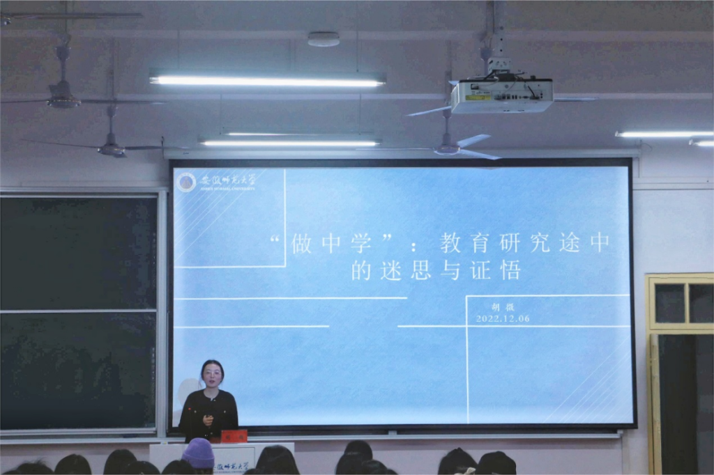 12月6日晚,“赭山青年学者论坛”(第十五期)在教学楼1401教室如期开讲。新进教师胡微博士受邀为在场师生带来了主题为《做中学:教育研究途中的迷思与证悟》的学术报告。副院长吴文涛以及全体教育学类硕士研究生到场学习。本期论坛由2022级研究生张乃迎主持。