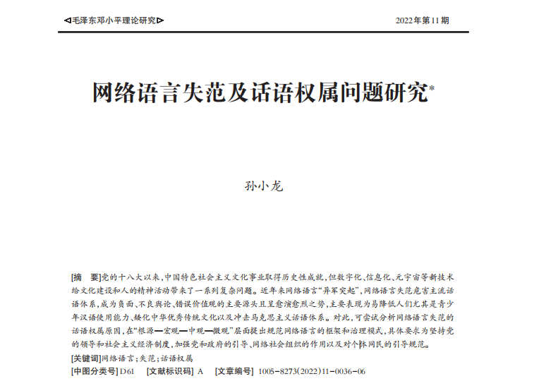 党的十八大以来,中国特色社会主义文化事业取得历史性成就,但数字化、信息化、元宇宙等新技术给文化建设和人的精神活动带来了一系列复杂问题。近年来网络语言“异军突起”,网络语言失范危害主流话语体系,成为负面、不良舆论、错误价值观的主要源头且呈愈演愈烈之势,主要表现为易降低人们尤其是青少年汉语使用能力、矮化中华优秀传统文化以及冲击马克思主义话语体系。对此,可尝试分析网络语言失范的话语权属原因,在“根源—宏观—中观—微观”层面提出规范网络语言的框架和治理模式,具体要求为坚持党的领导和社会主义经济制度,加强党和政府的引导、网络社会组织的作用以及对个体网民的引导规范。