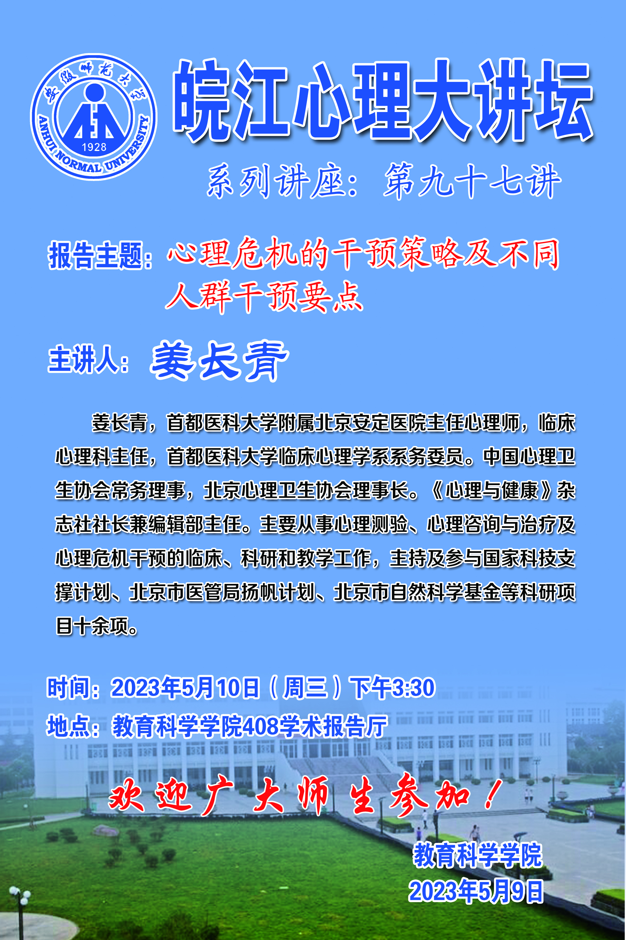 【学术预告】皖江心理大讲坛第九十七讲:心理危机的干预策略及不同人群干预要点
