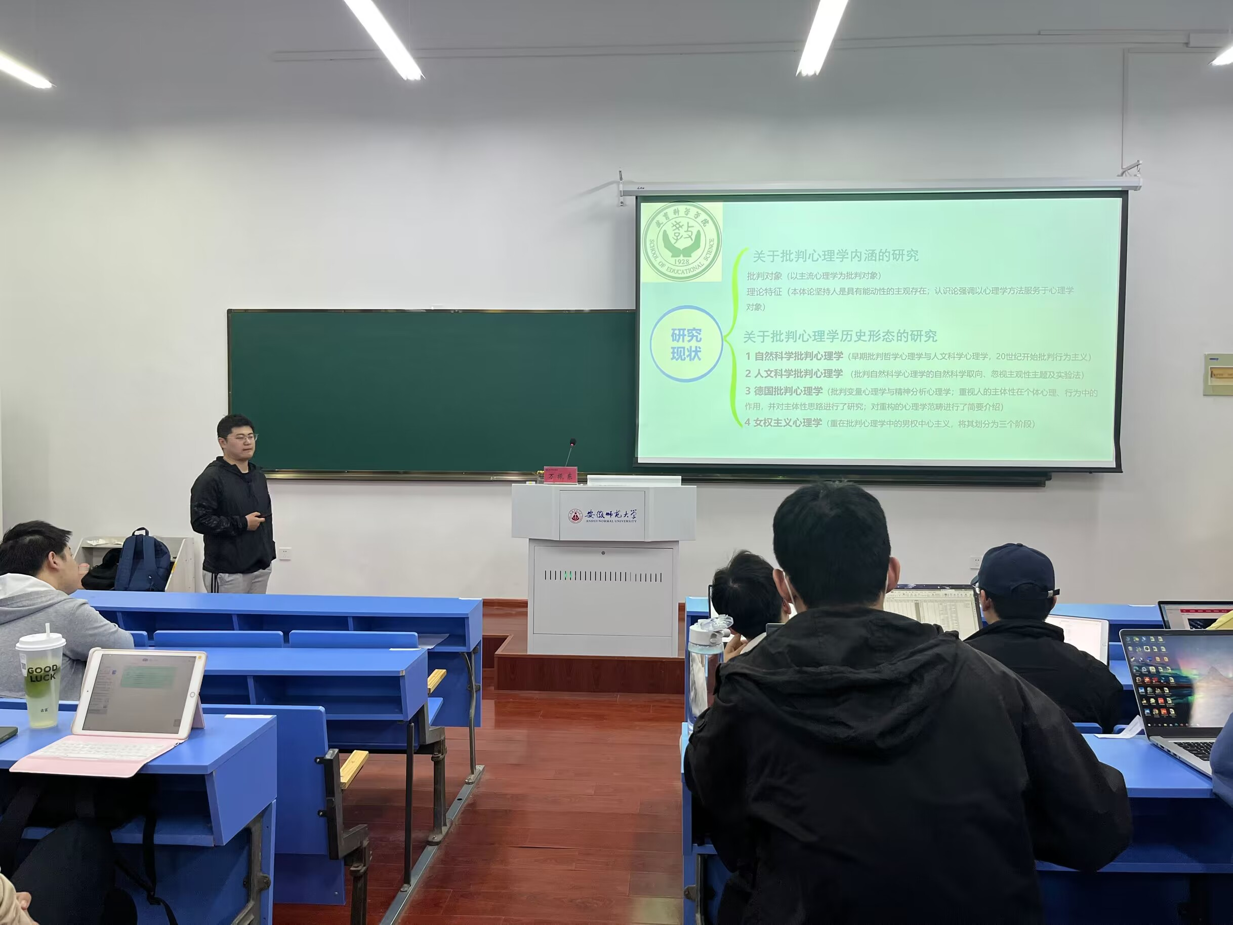 为进一步激发我院研究生学术创新活力,响应学校所开展的研究生学术活动月“大先生”讲堂,我院于5月10日下午,在教学楼1108教室开展第二十二期“赭山青年学者论坛”。新进教师万振东博士受邀为在场师生带来了主题为《批判心理学的主观认识论蕴涵及其历史流变》的学术报告。副院长吴文涛、青年教师谢宇、心理学类硕士研究生60余人到场学习。本期论坛由2022级研究生张乃迎主持。