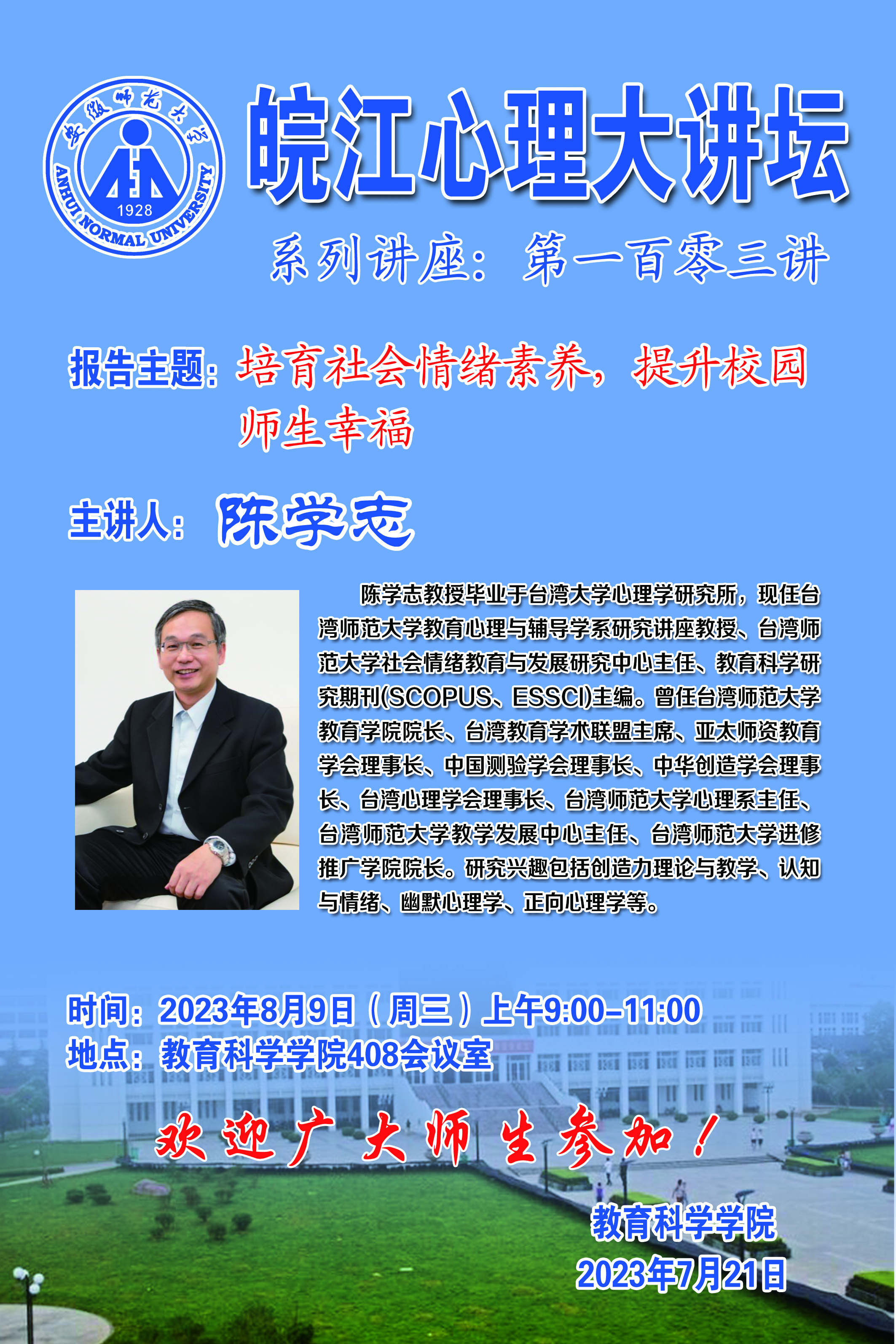 【学术预告】皖江心理大讲坛第一百零三讲——陈学志:培育社会情绪素养,提升校园师生幸福