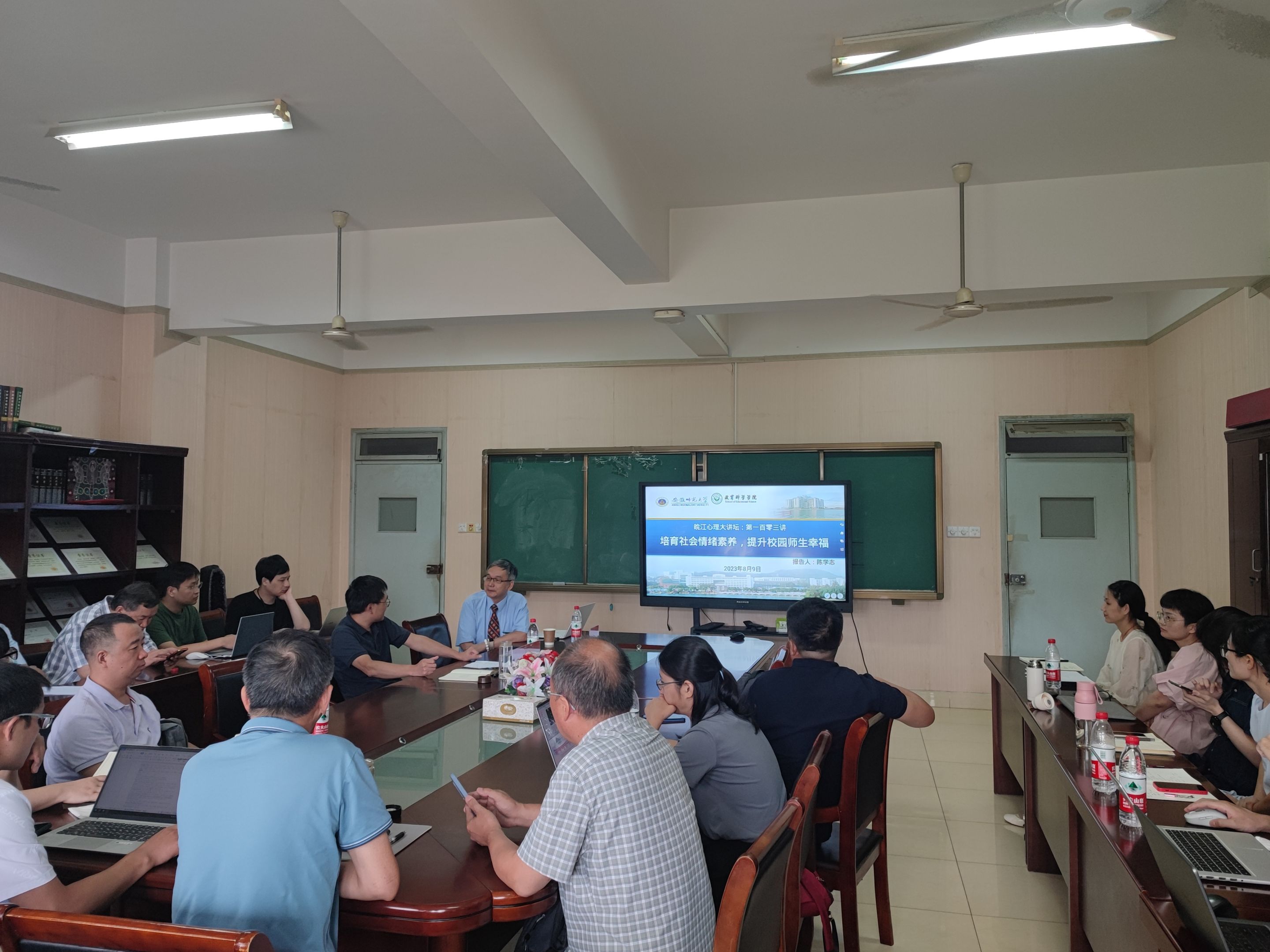 8月9日上午,皖江心理大讲坛第一百零三讲在教育科学学院408会议室如期开讲。台湾师范大学教育心理与辅导学系研究讲座教授、社会情绪教育与发展研究中心主任主编陈学志教授应邀为全院师生作了题为《培育社会情绪素养,提升校园师生幸福》的学术讲座。讲座由学院副院长韩建涛主持,心理学专业教师、部分留校心理学和心理健康教育专业硕士研究生到场学习。