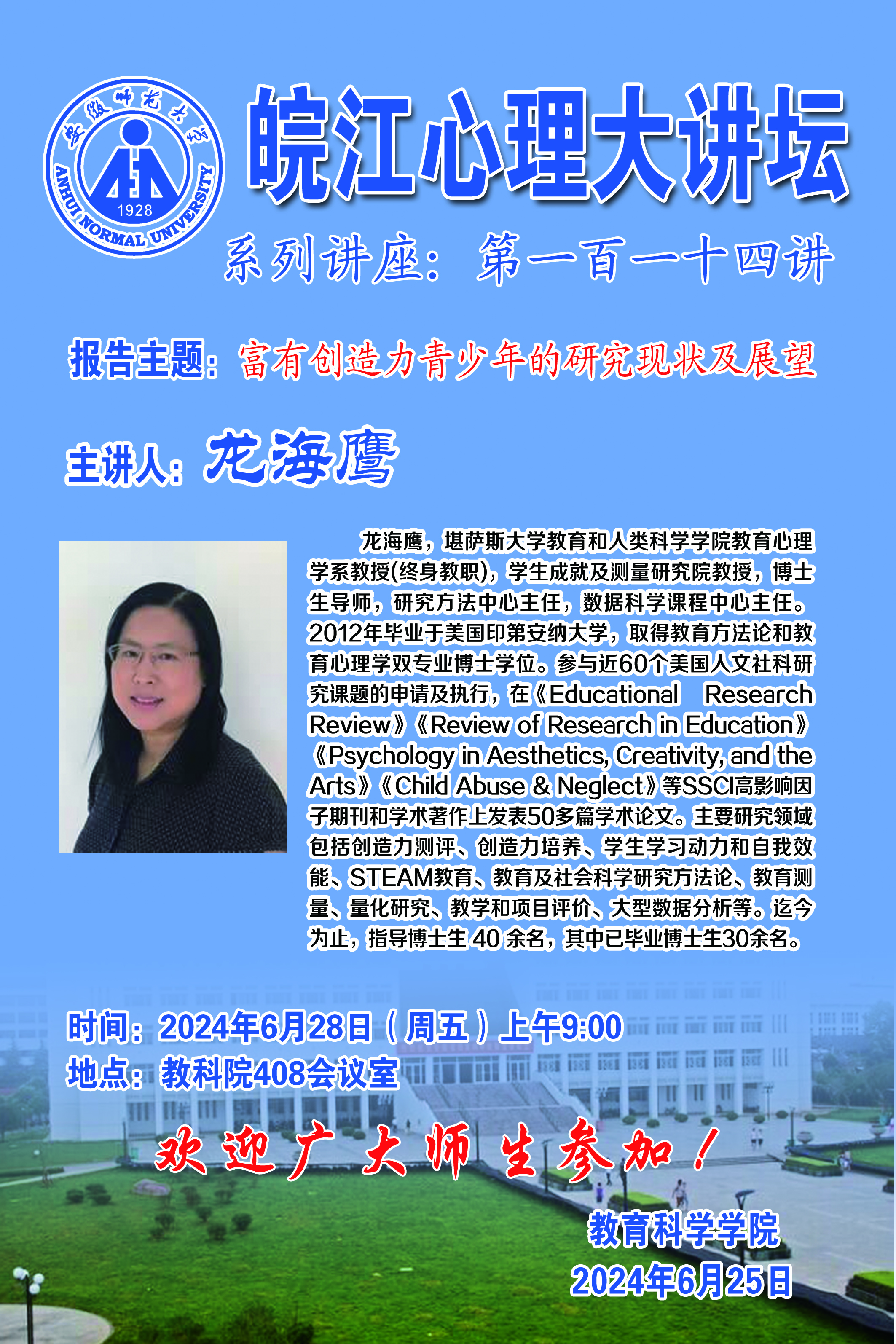 【学术预告】皖江心理大讲坛第一百一十四讲——龙海鹰:富有创造力青少年的研究现状及展望