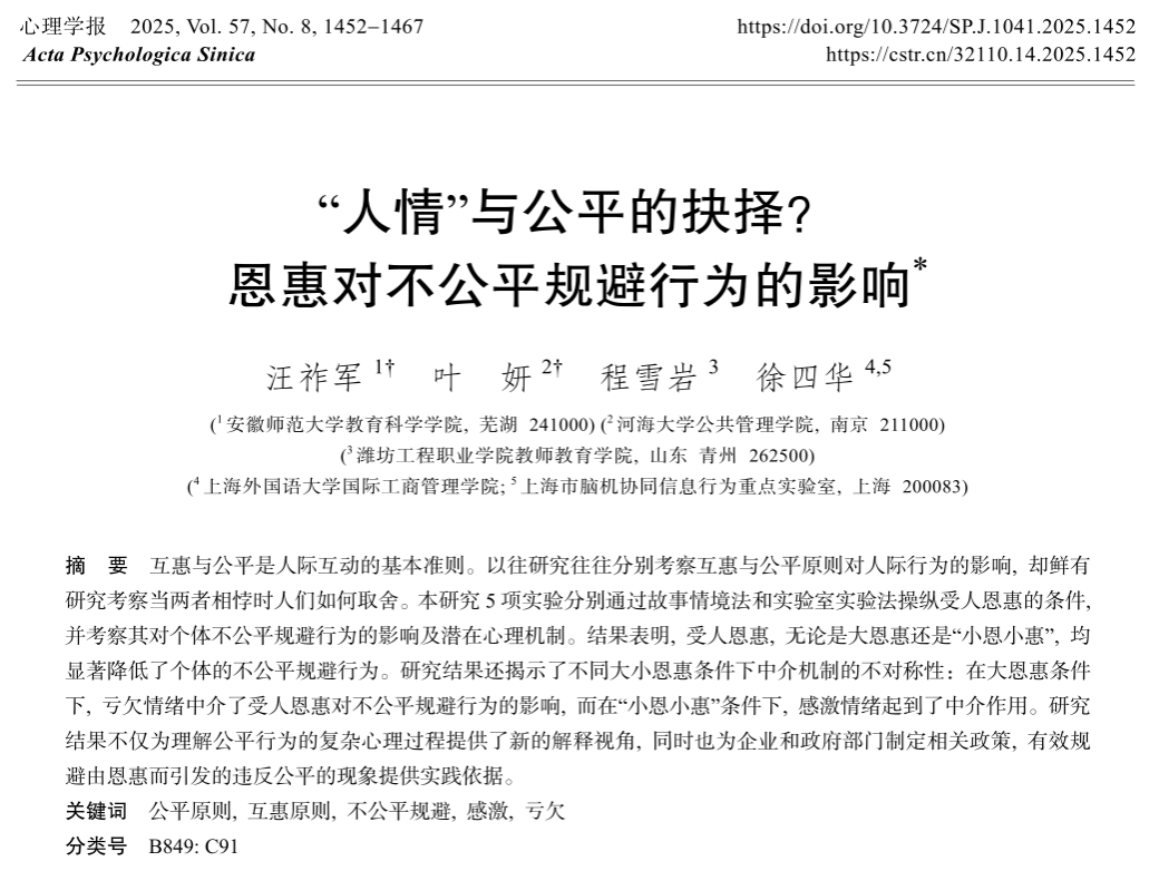 互惠与公平是人际互动的基本准则。以往研究往往分别考察互惠与公平原则对人际行为的影响, 却鲜有研究考察当两者相悖时人们如何取舍。本研究 5 项实验分别通过故事情境法和实验室实验法操纵受人恩惠的条件,并考察其对个体不公平规避行为的影响及潜在心理机制。结果表明, 受人恩惠, 无论是大恩惠还是“小恩小惠”, 均显著降低了个体的不公平规避行为。研究结果还揭示了不同大小恩惠条件下中介机制的不对称性:在大恩惠条件下, 亏欠情绪中介了受人恩惠对不公平规避行为的影响, 而在“小恩小惠”条件下, 感激情绪起到了中介作用。研究结果不仅为理解公平行为的复杂心理过程提供了新的解释视角, 同时也为企业和政府部门制定相关政策, 有效规避由恩惠而引发的违反公平的现象提供实践依据。
