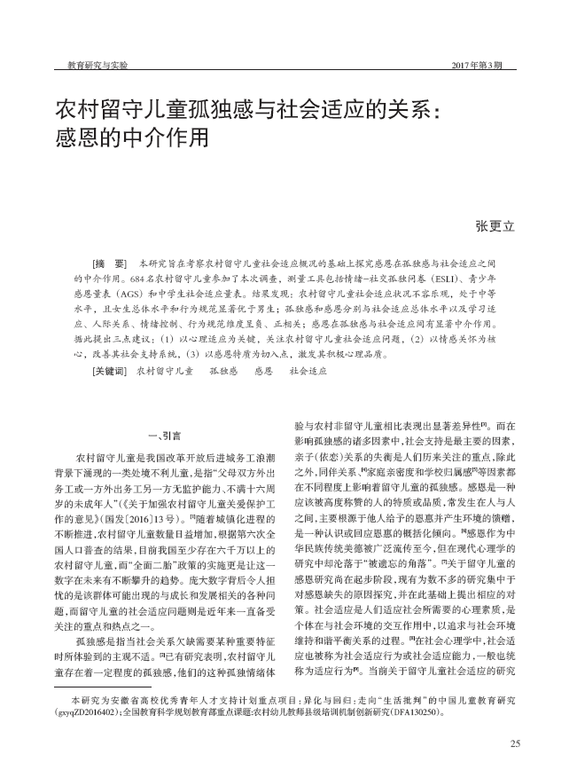 张更立:农村留守儿童孤独感与社会适应的关系:感恩的中介作用