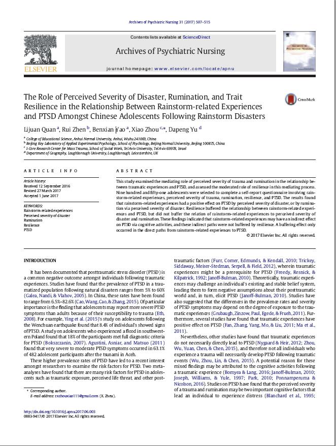全莉娟:The Role of Perceived Severity of Disaster, Rumination, and Trait Resilience