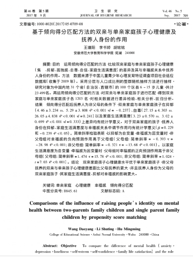 王道阳 李书婷 胡铭铭:基于倾向得分匹配方法的双亲与单亲家庭孩子心理健康及抚养人身份的作用