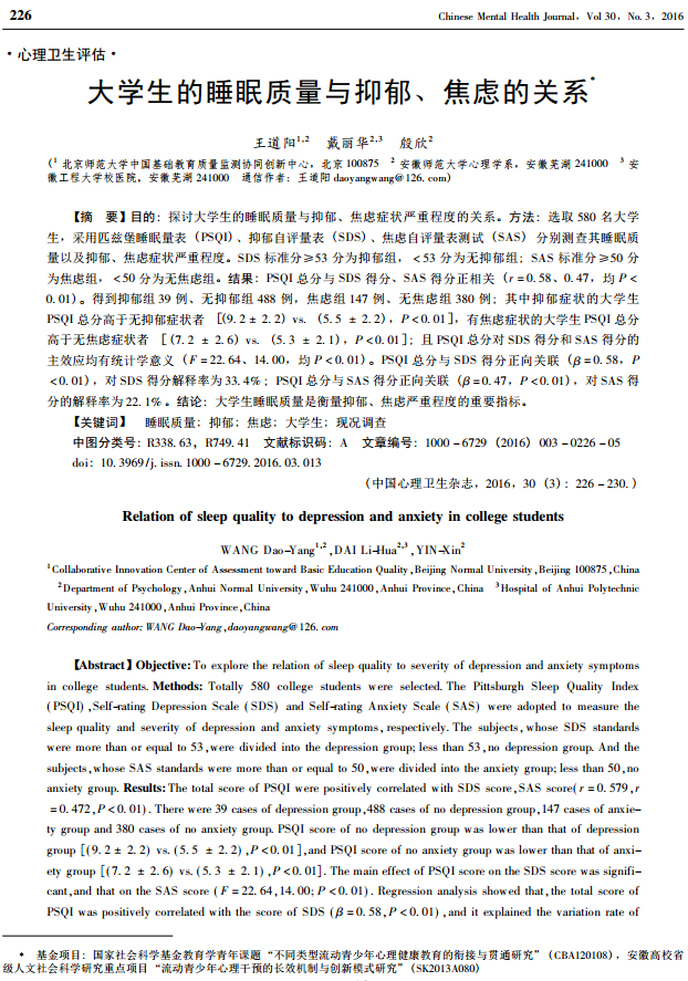 王道阳:大学生的睡眠质量与抑郁、焦虑的关系