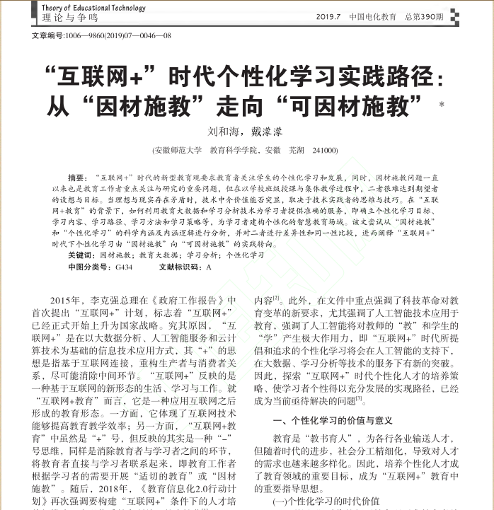 刘和海,戴濛濛:“互联网+”时代个性化学习实践路径:从“因材施教”走向“可因材施教”